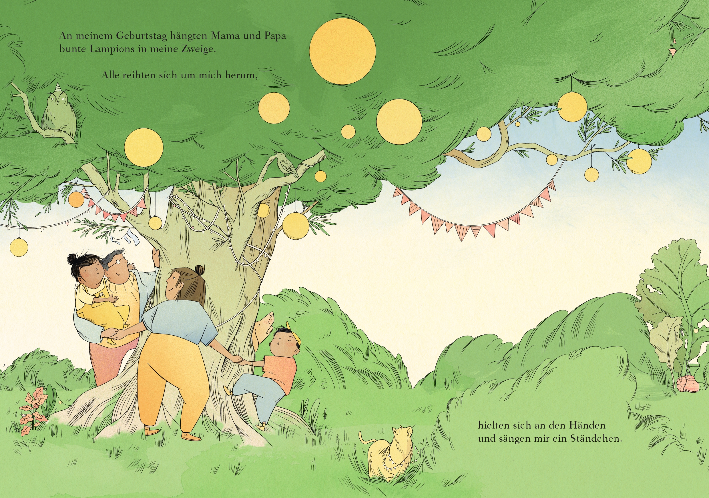 Ein Kind träumt sich hinein in den Wunsch, ein Baum zu sein. Ein großer Baum, der fest verwurzelt in der Erde steht, der lebendig ist und so stark, dass er Schutz bietet für viele: für die Nester der Vögel, die Mäusefamilie in der Erde unter ihm, für das Baumhaus des Bruders. Als Baum wäre das Kind unverrückbar und eins mit der Landschaft, dem Wind, dem nächtlichen Himmel. Es hätte viel Zeit, langsam zu wachsen. Andrea Hensgen spinnt denTraum eines Kindes aus, das nicht bleiben darf, wo es zu Hause war. Das aufbrechen muss mit Mutter, Vater, Bruder und Schwester zu einem Ort, den es nicht kennt. Hannah Brückner nimmt die feinen Fäden auf, setzt die Sehnsucht um in lichte Bilder, die nicht ohne Hoffnung sind auf das Austreiben neuer Wurzeln an einem neuen Ort.