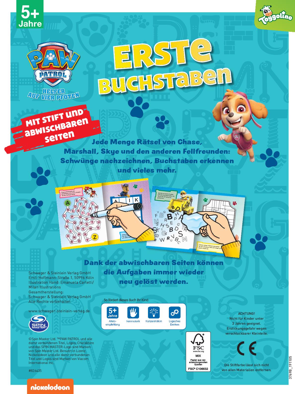 | Schlagworte | Abenteuerbucht • Ausmalen • Chase • Detektiv • einkreisen • Entdecken • erste Buchstaben • erstes Lernen • erstes Schreiben • erste Wörter • fehlerbilder • Fehler finden • Feinmotorik • Gegensätze • Kindergarten • Konzentration • Konzentrieren • Labyrinth • Lernheft • Lernspiel • Lern-Spiel-Buch • lernspielheft • Marshall • Mitgebsel • Nickelodeon • Paw Patrol • Rätsel • Reime • Rocky • Rubble • Ryder • Schreiben lernen • Schuleintritt • Schwungübungen • Skye • Spielerisch • Suchbild • Suchen • Verbinden • Vorschulbuch • Vorschule • Vorschulkind • Zahlen • Zahlen und Mengen • Zuma • Zuordnen |