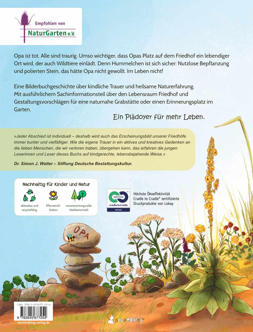 »Jeder Abschied ist individuell – deshalb wird auch das Erscheinungsbild unserer Friedhöfe immer bunter und vielfältiger. Wie die eigene Trauer in ein aktives und kreatives Gedenken an die lieben Menschen, die wir verloren haben, übergehen kann, das erfahren die jungen Leserinnen und Leser dieses Buchs auf kindgerechte, lebensbejahende Weise.«
