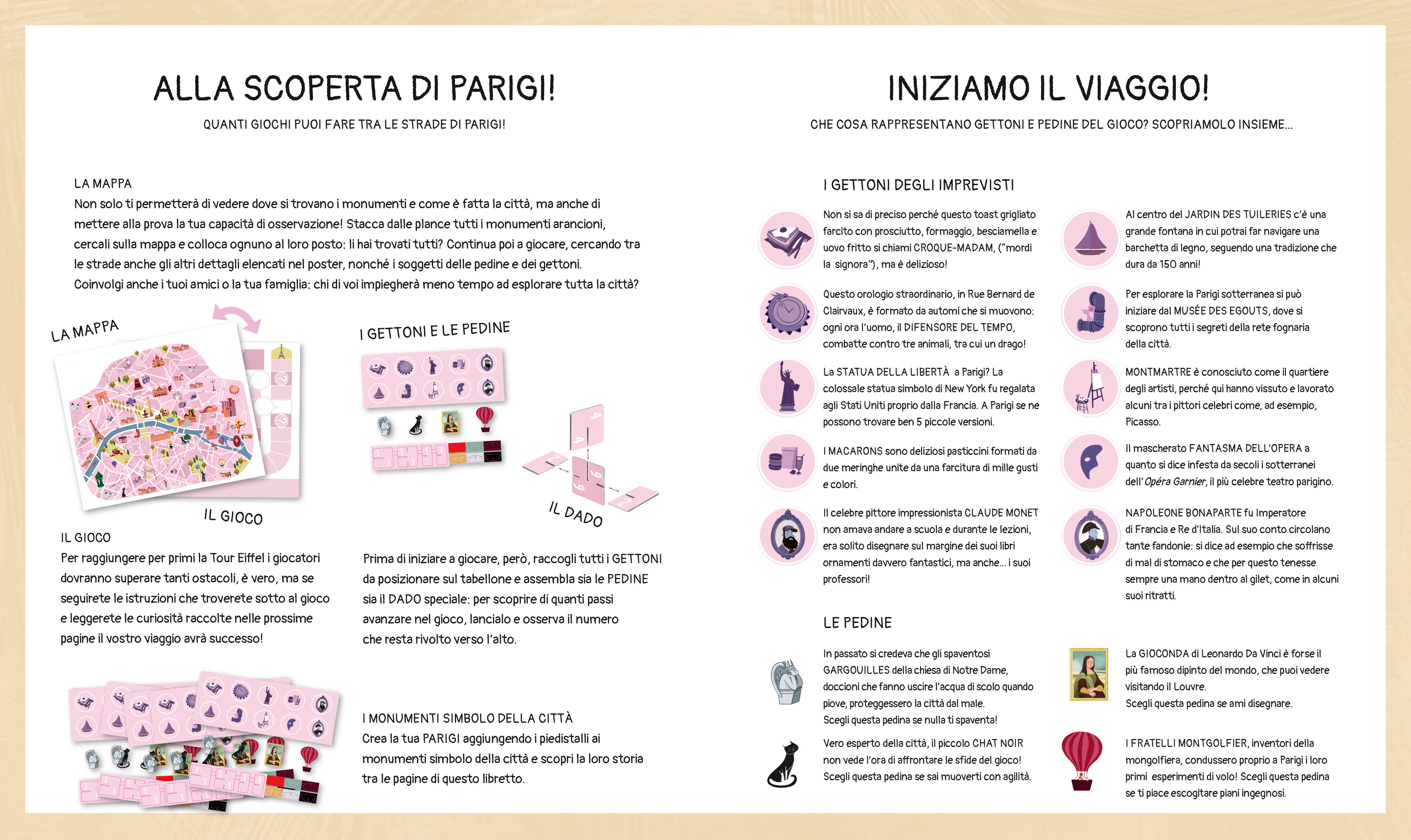 Eine Schachtel ist nicht nur eine Schachtel! In dieser neuen interaktiven Serie ist jede Box einer berühmten Stadt gewidmet und dein außergewöhnlicher Kasten enthält ein kleines Paris mit Mona Lisa, Eiffelturm, Metro ... Du findest auf stabilem Pappkarton Denkmäler, Figuren und Verkehrsmittel, die du ganz leicht herauslösen kannst. Für alle gibt es einen Sockel, damit sie aufrecht über das Spielfeld bewegt werden können. Nutze den Stadtplan im Posterformat für ein Suchspiel, bei dem versteckte Elemente gefunden werden müssen oder für ein Brettspiel im Stil eines Gänsespiels um die berühmtesten Sehenswürdigkeiten der Stadt. Einfach gleich mal losspielen!