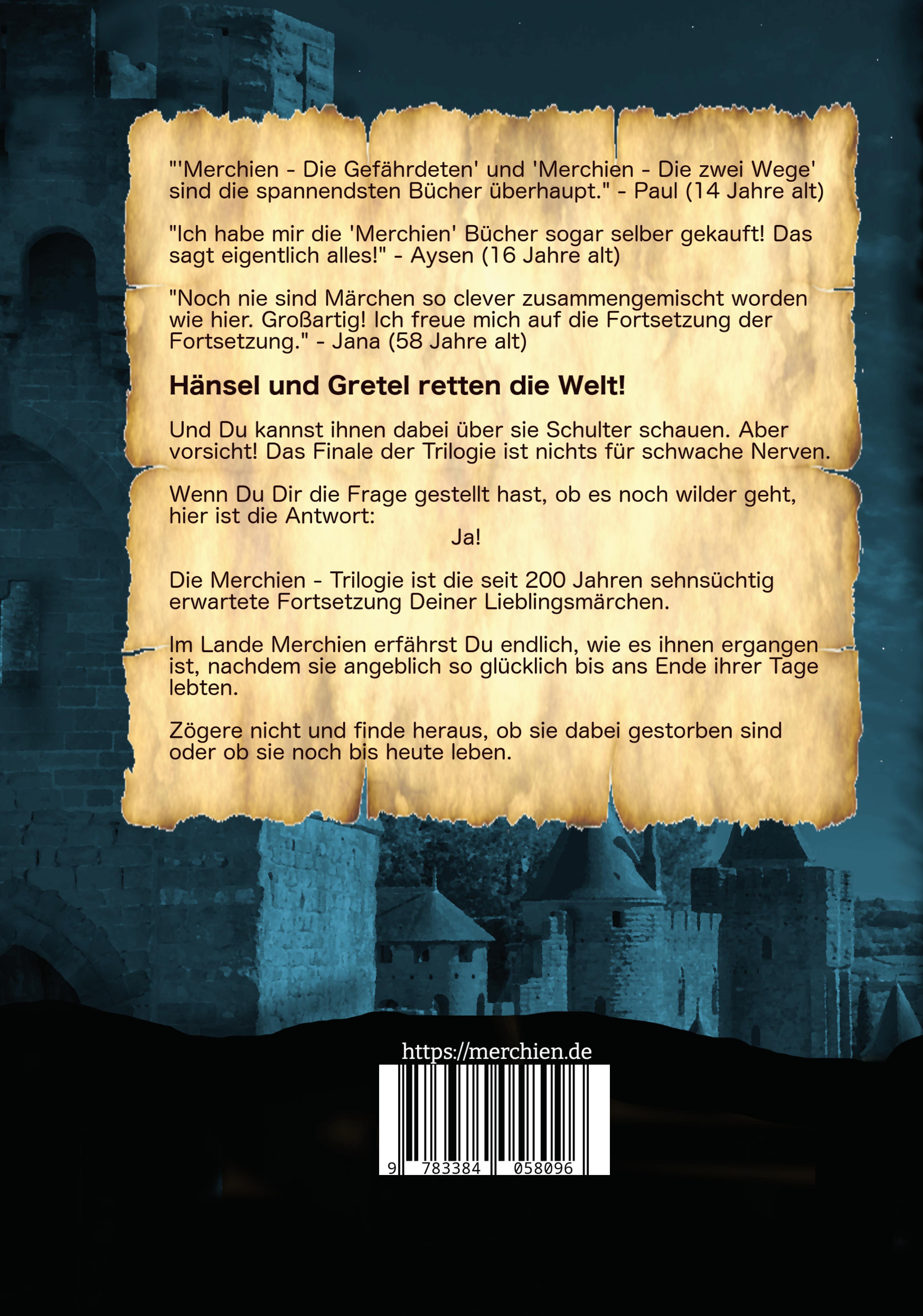 Der Roman ist der dritte Band der Fortsetzung von Hänsel und Gretel (und vieler anderer Märchen).In den ersten beiden Bänden machten sich unsere Helden auf die Suche nach einer entführten Prinzessin. Nun aber stellen sie fest, dass sich ihnen auf ihrer Mission noch ganz andere Abenteuer in den Weg stellen. Die böse Hexe und Rumpelstilzchen treiben ihr übles Spiel mit ihnen, bis es sogar für sie gefährlich wird.Eine unerwartete Gefahr macht sich daran, ganz Merchien zu zerstören.Es geht buchstäblich um Leben und TOD."...und wenn sie nicht gestorben sind, dann überleben sie hoffentlich bis zum Finale der Trilogie."