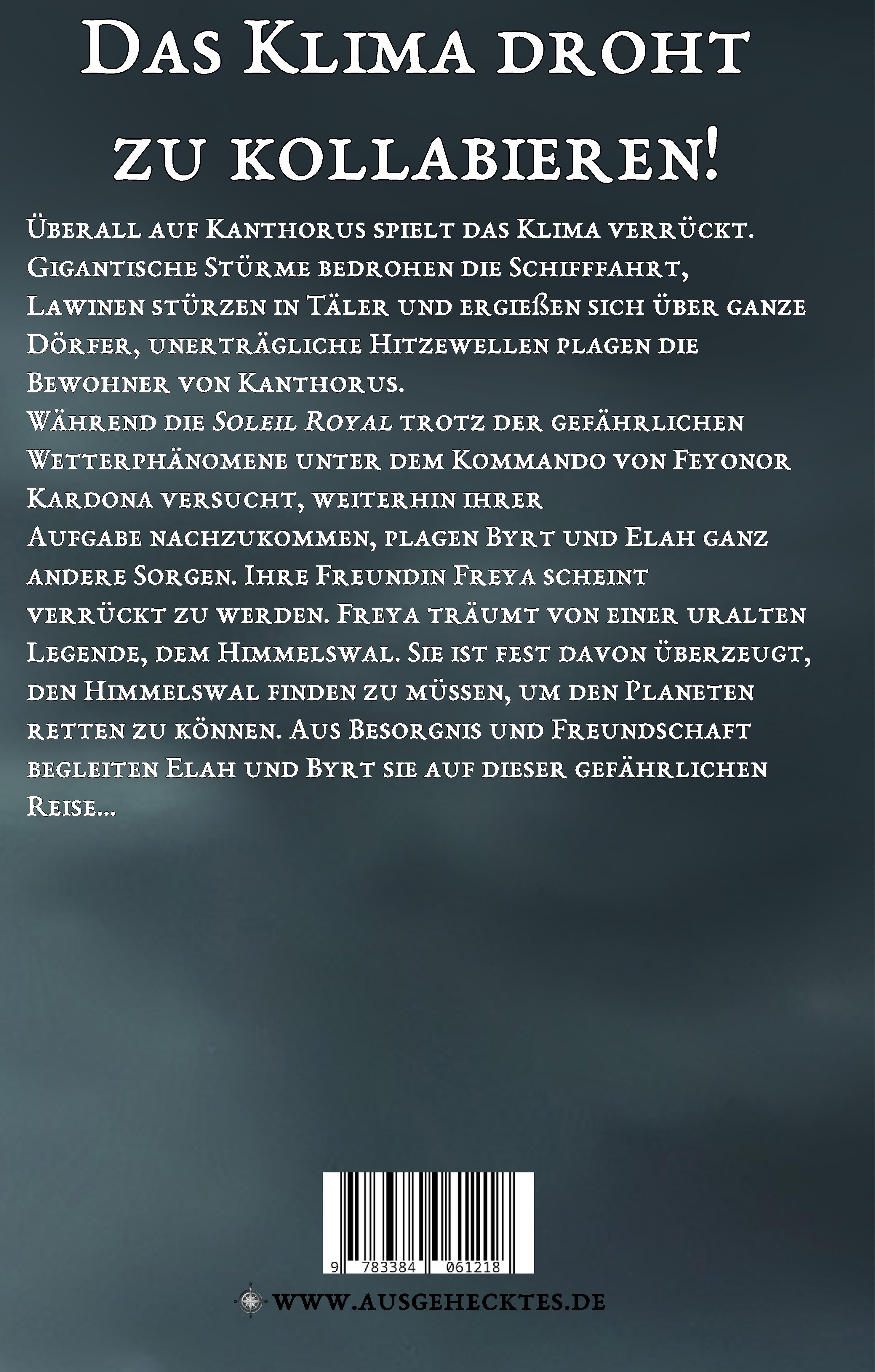 Überall auf Kanthorus spielt das Klima verrückt. Gigantische Stürme bedrohen die Schifffahrt, Lawinen stürzen in Täler und ergießen sich über ganze Dörfer, unerträgliche Hitzewellen plagen die Bewohner von Kanthorus. Während die Soleil Royal trotz der gefährlichen Wetterphänomene unter dem Kommando von Feyonor Kardona versucht, weiterhin ihrer Aufgabe nachzukommen, plagen Byrt und Elah ganz andere Sorgen. Ihre Freundin Freya scheint verrückt zu werden. Die Parda träumt von einer uralten Legende, dem Himmelswal. Sie ist fest davon überzeugt, dieses sagenhafte Wesen finden zu müssen. Aus Besorgnis und Freundschaft begleiten Elah und Byrt sie auf dieser gefährlichen Reise...