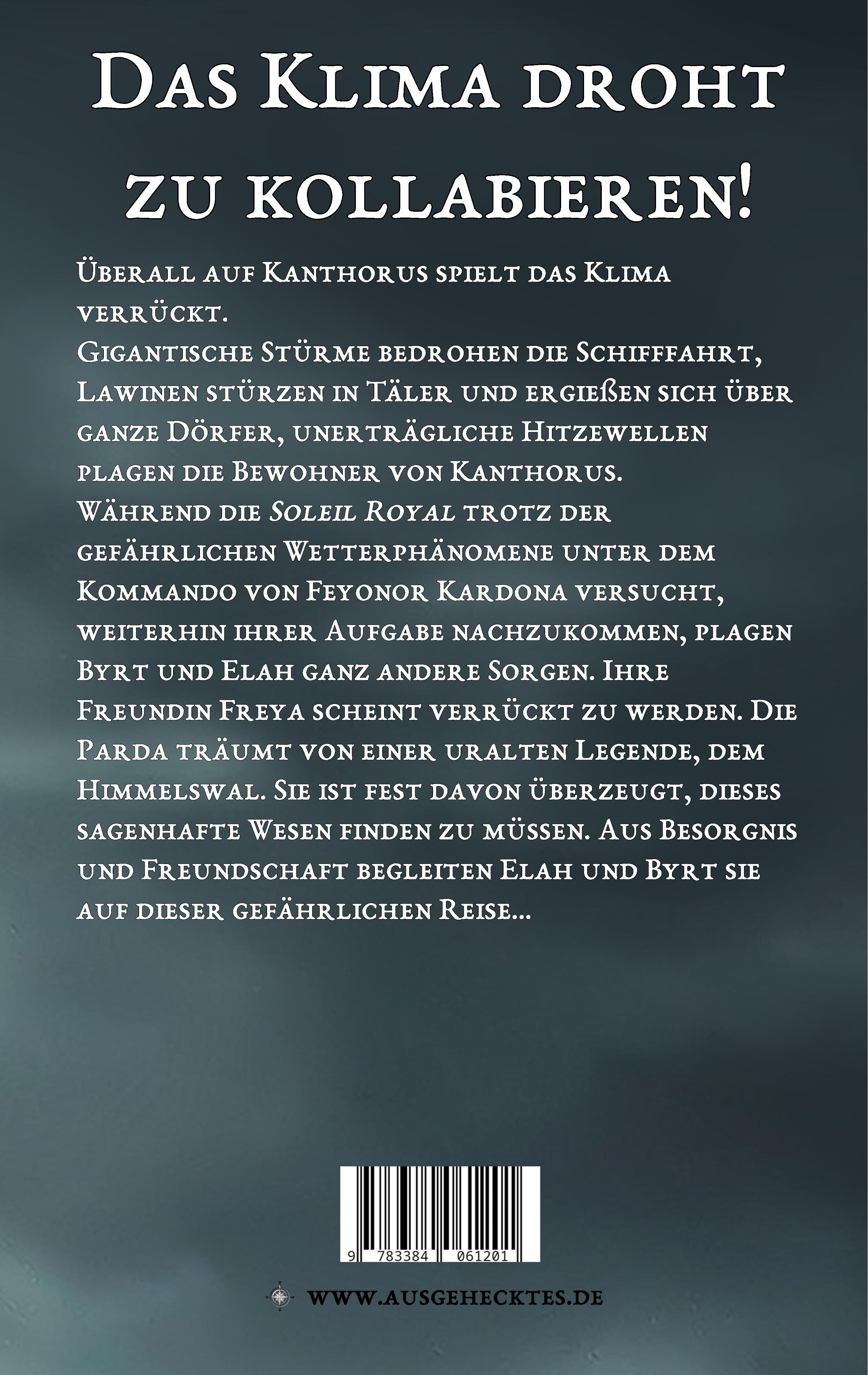 Überall auf Kanthorus spielt das Klima verrückt. Gigantische Stürme bedrohen die Schifffahrt, Lawinen stürzen in Täler und ergießen sich über ganze Dörfer, unerträgliche Hitzewellen plagen die Bewohner von Kanthorus. Während die Soleil Royal trotz der gefährlichen Wetterphänomene unter dem Kommando von Feyonor Kardona versucht, weiterhin ihrer Aufgabe nachzukommen, plagen Byrt und Elah ganz andere Sorgen. Ihre Freundin Freya scheint verrückt zu werden. Die Parda träumt von einer uralten Legende, dem Himmelswal. Sie ist fest davon überzeugt, dieses sagenhafte Wesen finden zu müssen. Aus Besorgnis und Freundschaft begleiten Elah und Byrt sie auf dieser gefährlichen Reise...