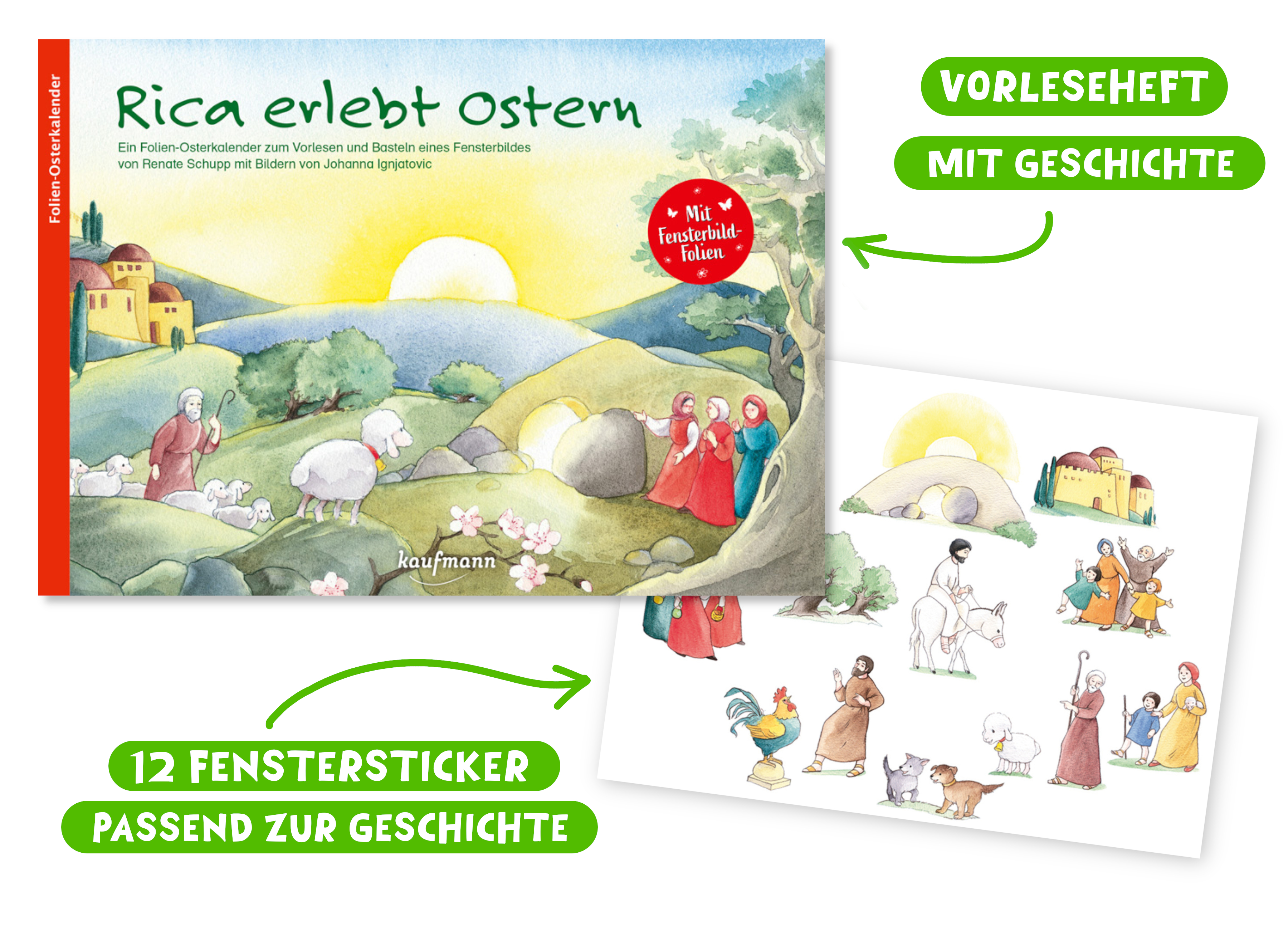 - Dem Kinderbuch liegt ein Fensterbild bei: Zu jeder der 14 Geschichten gehört ein Folienbild, das am Fenster angebracht werden kann. An Ostern ist das Fensterbild dann vollständig.