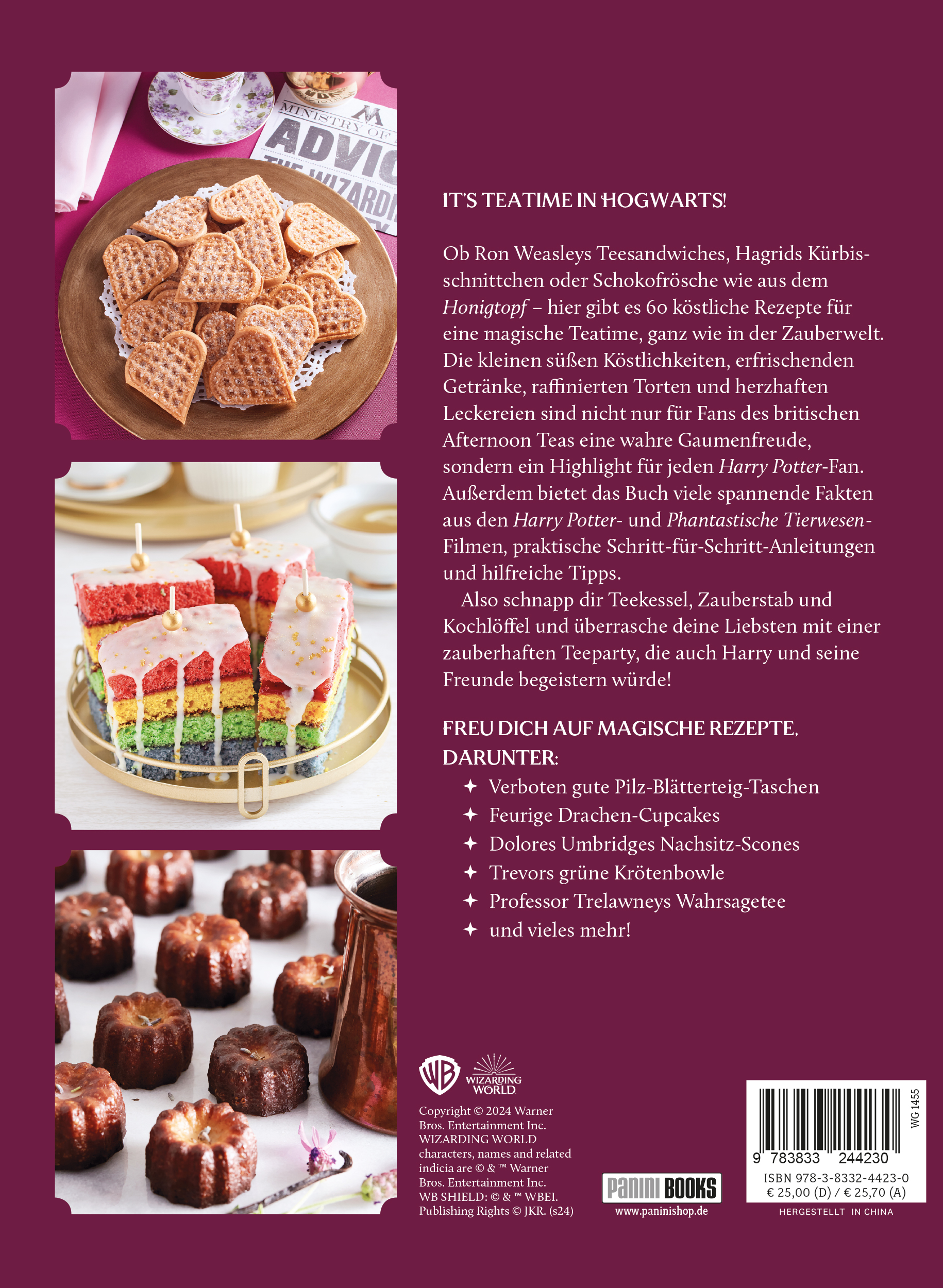 | Schlagworte | Backbuch • Backen • Cookbook • Essen • F24 • Häppchen • Harry Potter • harry potter cookbook • harry potter geschenk • Hogwarts • HP • Kinderbuch • Kochbuch • Kochen • magische Rezepte • Panini • PBK • Phantastische Tierwesen • Potterhead • Rezept • Rezepte • Snacks • Teatime • Tea Time • Teatime in Hogwarts • Teeparty • Zauberwelr |