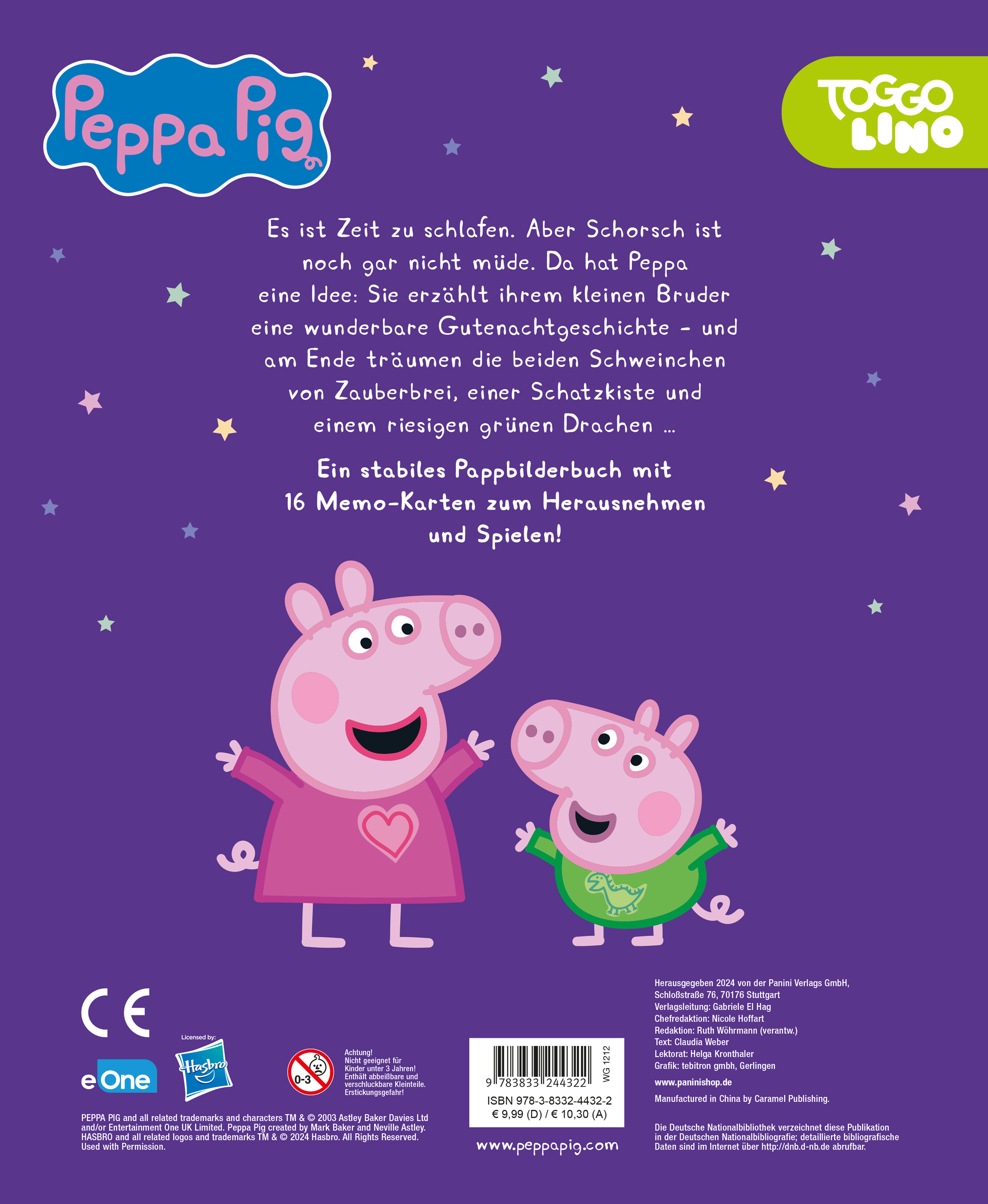 Es ist Zeit zu schlafen. Aber Schorsch ist noch gar nicht müde. Da hat Peppa eine Idee: Sie erzählt ihrem kleinen Bruder eine wunderbare Gutenachtgeschichte - und am Ende träumen die beiden Schweinchen von Zauberbrei, einer Schatzkiste und einem riesigen grünen Drachen ...Ein stabiles Pappbilderbuch mit 16 Memo-Karten zum Herausnehmen und Spielen!