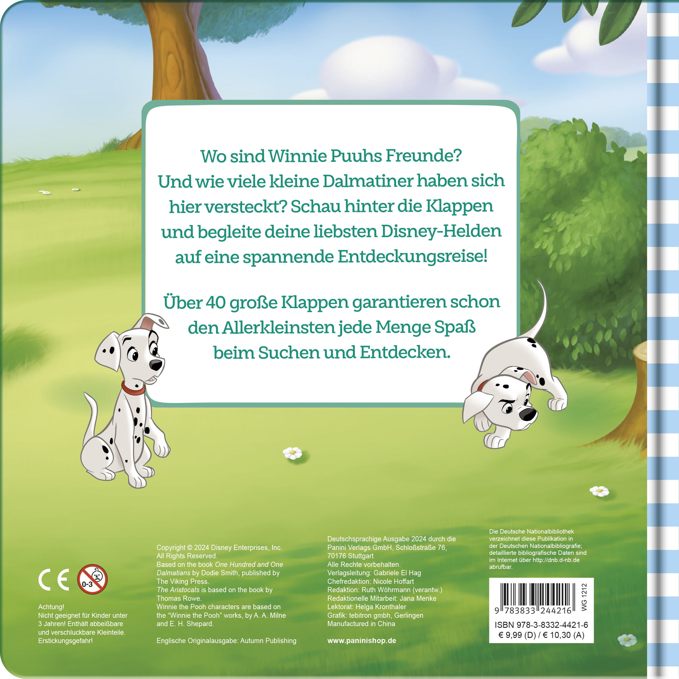 Wo sind Winnie Puuhs Freunde? Und wie viele kleine Dalmatiner haben sich hier versteckt? Schau hinter die Klappen und begleite deine liebsten Disney-Helden auf eine spannende Entdeckungsreise! Über 40 große Klappen garantieren schon den Allerkleinsten jede Menge Spaß beim Suchen und Entdecken.