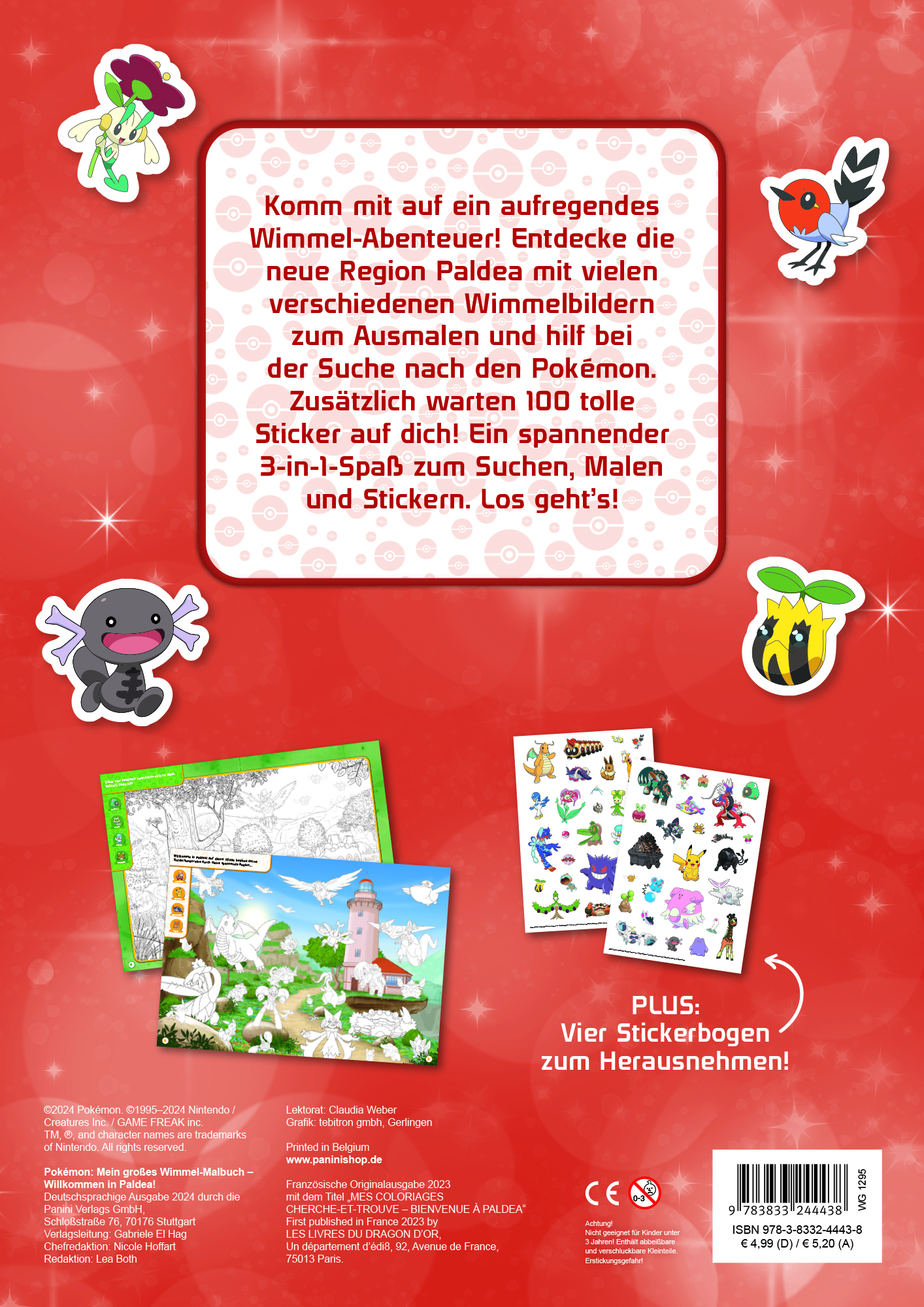 Komm mit auf ein aufregendes Wimmel-Abenteuer! Entdecke die neue Region Paldea mit vielen verschiedenen Wimmelbildern zum Ausmalen und hilf bei der Suche nach den Pokémon. Zusätzlich warten 100 tolle Sticker auf dich! Ein spannender 3-in-1-Spaß zum Suchen, Malen und Stickern. Los geht's! PLUS: Vier Stickerbögen zum Herausnehmen!