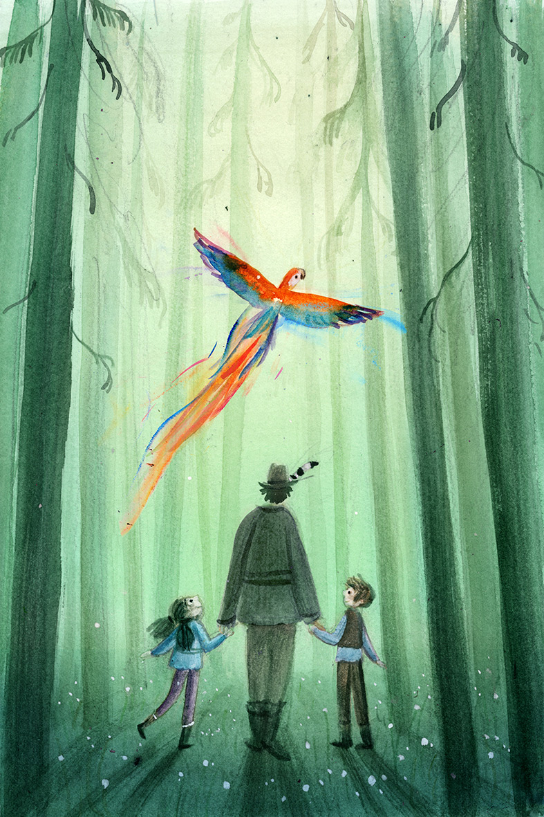 Der Vater von Dunja und Jorkos ist Holzfäller. Jeden Tag geht er mit seiner Axt in den Wald, doch eines Abends kehrt er nicht zurück. Als Dunja einen Traum hat, der ihr verrät, wo sie ihren Vater finden kann, beschließt sie, sich auf die Suche zu machen. Zusammen mit Jorkos schleicht sie sich aus dem Haus – und schon beginnt eine spannende, geheimnisvolle Reise, bei der sieben Federn eines bunten Papageis eine wichtige Rolle spielen. Sie gelangen zur Nebelkönigin, die den Vater gefangen hält – und mit Hilfe des Papageis gelingt es den beiden Kindern, ihn zu befreien …