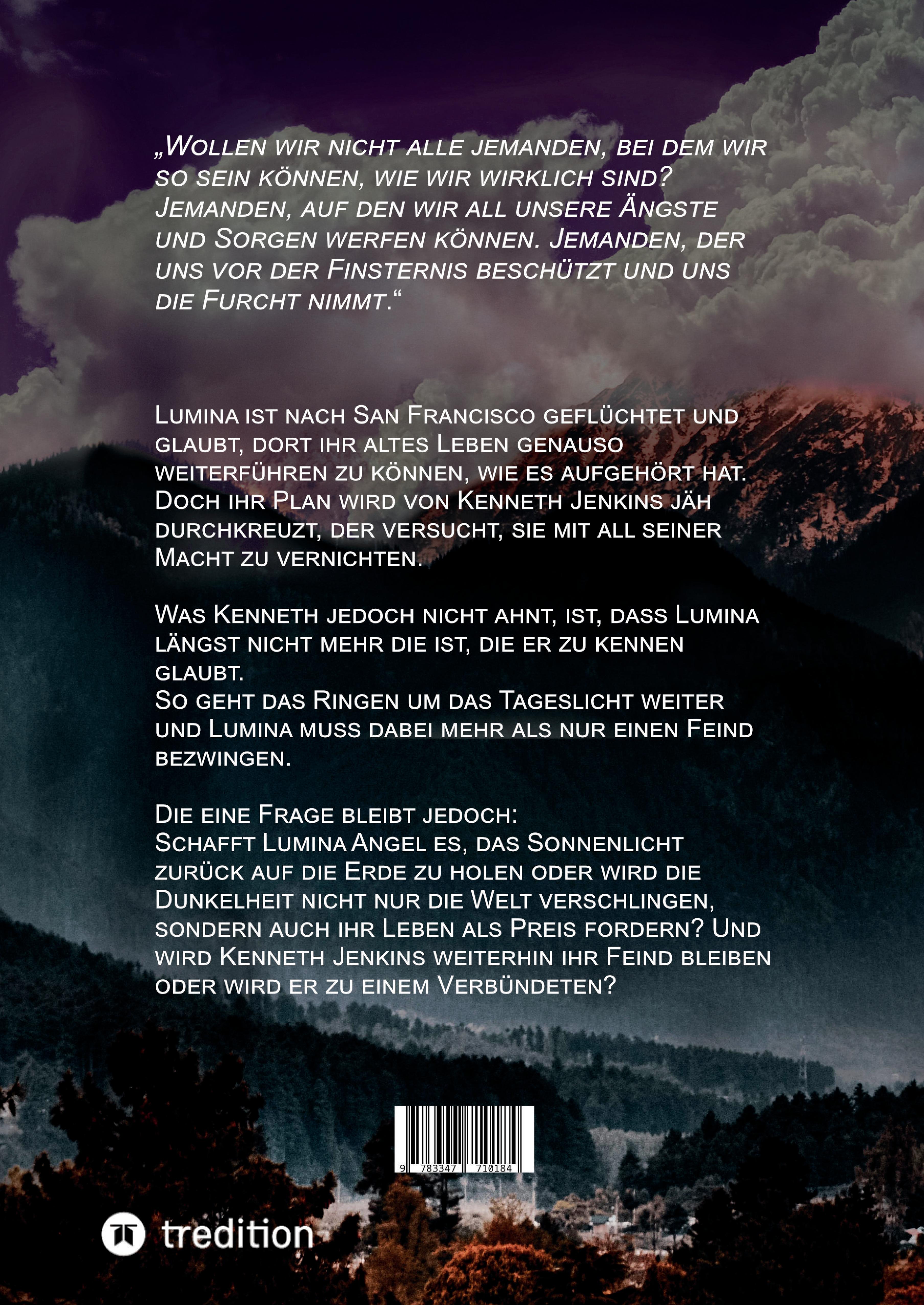 "Wollen wir nicht alle jemanden, bei dem wir so sein können, wie wir wirklich sind? Jemanden, auf den wir all unsere Ängste und Sorgen werfen können. Jemanden, der uns vor der Finsternis beschützt und uns die Furcht nimmt."Lumina ist nach San Francisco geflüchtet und glaubt, dort ihr altes Leben genauso weiterführen zu können, wie es aufgehört hat. Doch ihr Plan wird von Kenneth Jenkins jäh durchkreuzt, der versucht, sie mit all seiner Macht zu vernichten. Was Kenneth jedoch nicht ahnt, ist, dass Lumina längst nicht mehr die ist, die er zu kennen glaubt. So geht das Ringen um das Tageslicht weiter und Lumina muss dabei mehr als nur einen Feind bezwingen. Die eine Frage bleibt jedoch:Schafft Lumina Angel es, das Sonnenlicht zurück auf die Erde zu holen oder wird die Dunkelheit nicht nur die Welt verschlingen, sondern auch ihr Leben als Preis fordern? Und wird Kenneth Jenkins weiterhin ihr Feind bleiben oder wird er zu einem Verbündeten?Hat es dein Interesse geweckt? Dann ist die Daylight Saga genau das Richtige für dich.