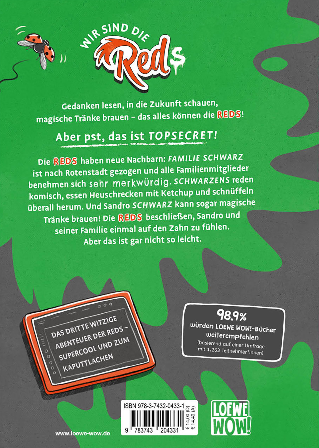 Die Reds haben neue Nachbarn: Familie Schwarz ist nach Rotenstadt gezogen und alle Familienmitglieder benehmen sich sehr merkwürdig. Schwarzens reden komisch, essen Heuschrecken mit Ketchup und Algen-Kuchen und schnüffeln überall herum. Und Sandro Schwarz kann sogar magische Tränke brauen. Dabei ist er doch gar kein Rotling. Die Reds beschließen, Sandro und seiner Familie einmal auf den Zahn zu fühlen – und finden eine geheimnisvolle Formel!