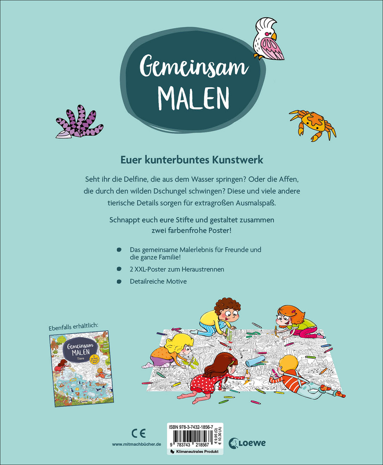 GEMEINSAM MALEN? KEIN PROBLEM! Seht ihr die Delfine, die aus dem Wasser springen? Oder die Affen, die durch den wilden Dschungel schwingen? Diese und viele andere tierische Details verstecken sich in den riesengroßen Ausmalmotiven. Die meisten Kinder haben Spaß am Malen. Viele kleine Künstler*innen freuen sich dabei aber auch über Unterstützung, egal ob von Geschwistern, Freund*innen oder Erwachsenen. Deshalb sorgt diese besondere Malbuchreihe gezielt für gemeinschaftlichen Malspaß. Dank der Perforierung können die riesengroßen Poster leicht herausgetrennt werden. Sie bieten genug Platz, um der Kreativität freien Lauf zu lassen und zusammen ein Bild zu gestalten. Dabei wird ganz nebenbei auch die soziale Kompetenz aller Beteiligten gestärkt. Und sind die Bilder dann ausgemalt, verschönern sie garantiert jedes Kinderzimmer!