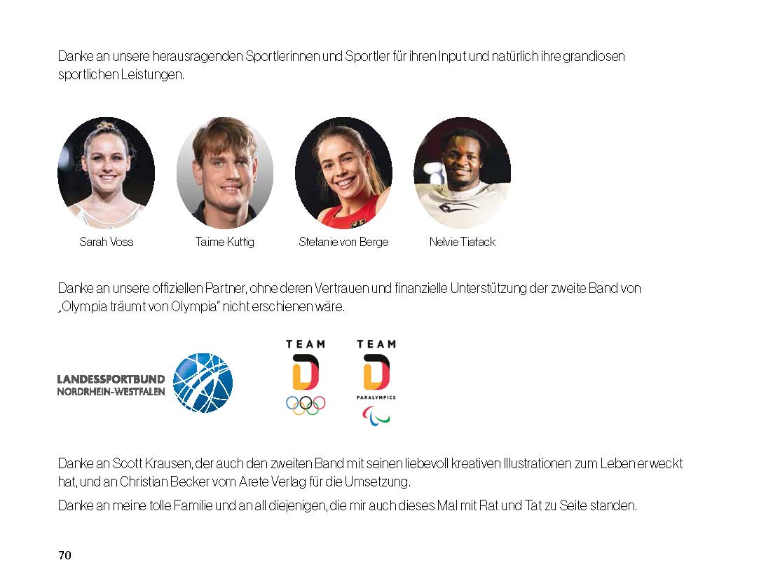 Im zweiten Teil des Mitmach-Buches "Olympia träumt von Olympia" erlebt Olympia wieder spannende Abenteuer mit weiteren Spitzensportlerinnen und Spitzensportlern und freut sich dabei über Unterstützung von fleißigen Trainingspartnern zu Hause.Gemeinsam mit ihrem Freund Emir besucht Olympia die Turnerin Sarah Voss (Deutsche Meisterin), Blindenfußballer Taime Kuttig (Blindenfußball-Nationalspieler) und die Box-Asse Stefanie von Berge (Europameisterin) und Nelvie Tiafack (Europameister)."Kinder für Sport und Bewegung zu gewinnen, ist uns eine absolute Herzensangelegenheit. Dieses Buch ist ein toller Ansatz, um Kinder für die Vielzahl an Sportangeboten in Deutschland zu begeistern. Wir hoffen, dass wir damit viele Kinder und ihre Familien erreichen und motivieren können." (Martin Wonik, Geschäftsführer der Sportjugend des Landessportbundes NRW)"Dieses Buch macht es möglich, dass Kinder aus erster Hand erfahren, was es heißt Leistungssportlerin oder Leistungssportler zu sein. Das ist einzigartig! Wir freuen uns sehr, dass olympische und jetzt auch paralympische Sportarten damit mehr Aufmerksamkeit bekommen und können hoffentlich dazu beitragen, viele Kinder für Sport zu begeistern." (Miriam Welte, DOSB Vizepräsidentin und Bahnrad-Olympiasiegerin) "Ich bin unheimlich stolz, dass wir für diesen zweiten Teil erneut solche herausragenden Sportlerinnen und Sportler gewinnen konnten. Lasst euch von ihrer Begeisterung für ihren Sport anstecken und habt viel Spaß dabei!" (Victoria von Eynatten, Autorin und ehemalige Stabhochspringerin)