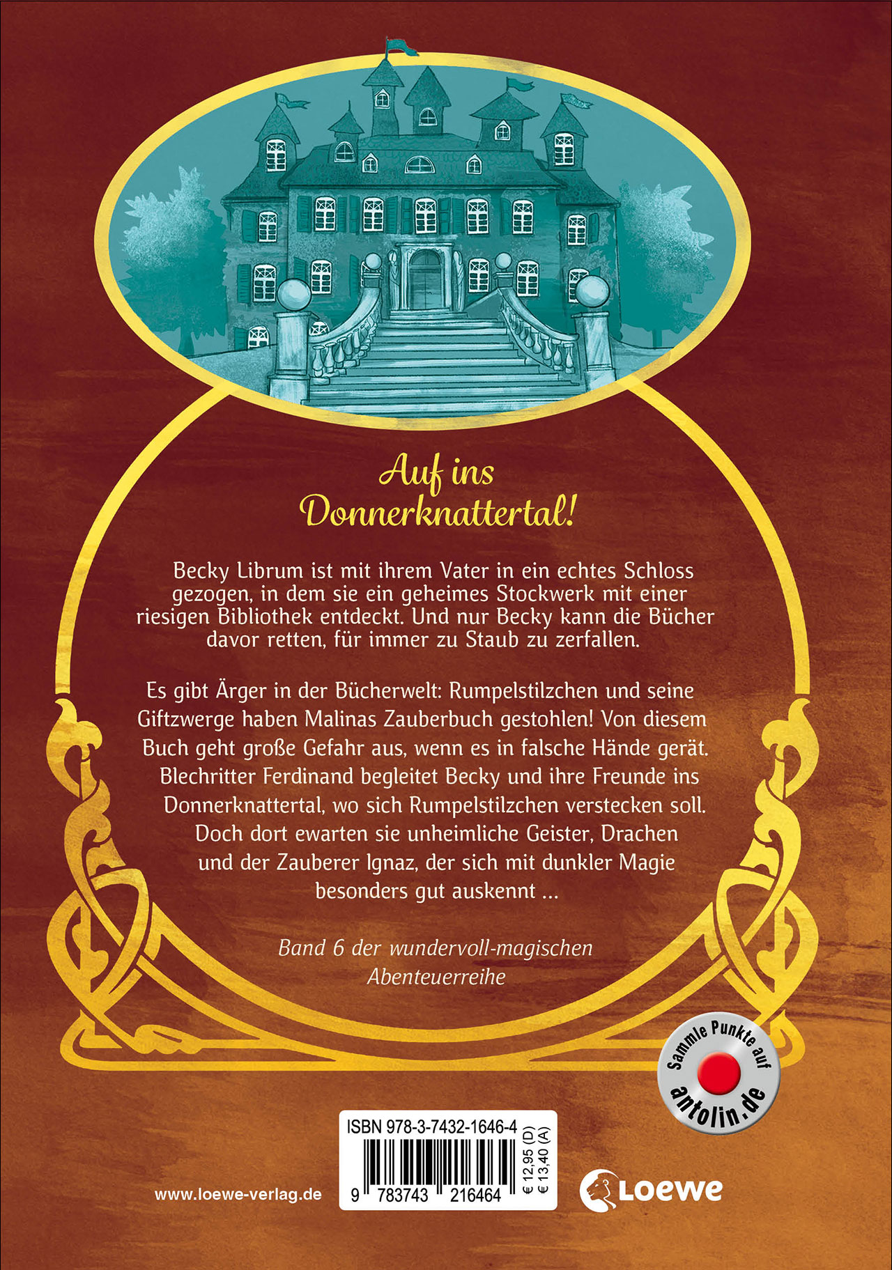 Es gibt Ärger in der Bücherwelt: Rumpelstilzchen und seine Giftzwerge haben Malinas Zauberbuch gestohlen! Von diesem Buch geht große Gefahr aus, wenn es in falsche Hände gerät. Blechritter Ferdinand begleitet Becky und ihre Freunde ins gespenstische Donnerknattertal, wo sich Rumpelstilzchen verstecken soll. Doch dort begegnen sie zunächst unheimlichen Geistern, Drachen und dem Zauberer Ignaz, der sich mit dunkler Magie besonders gut auskennt ...