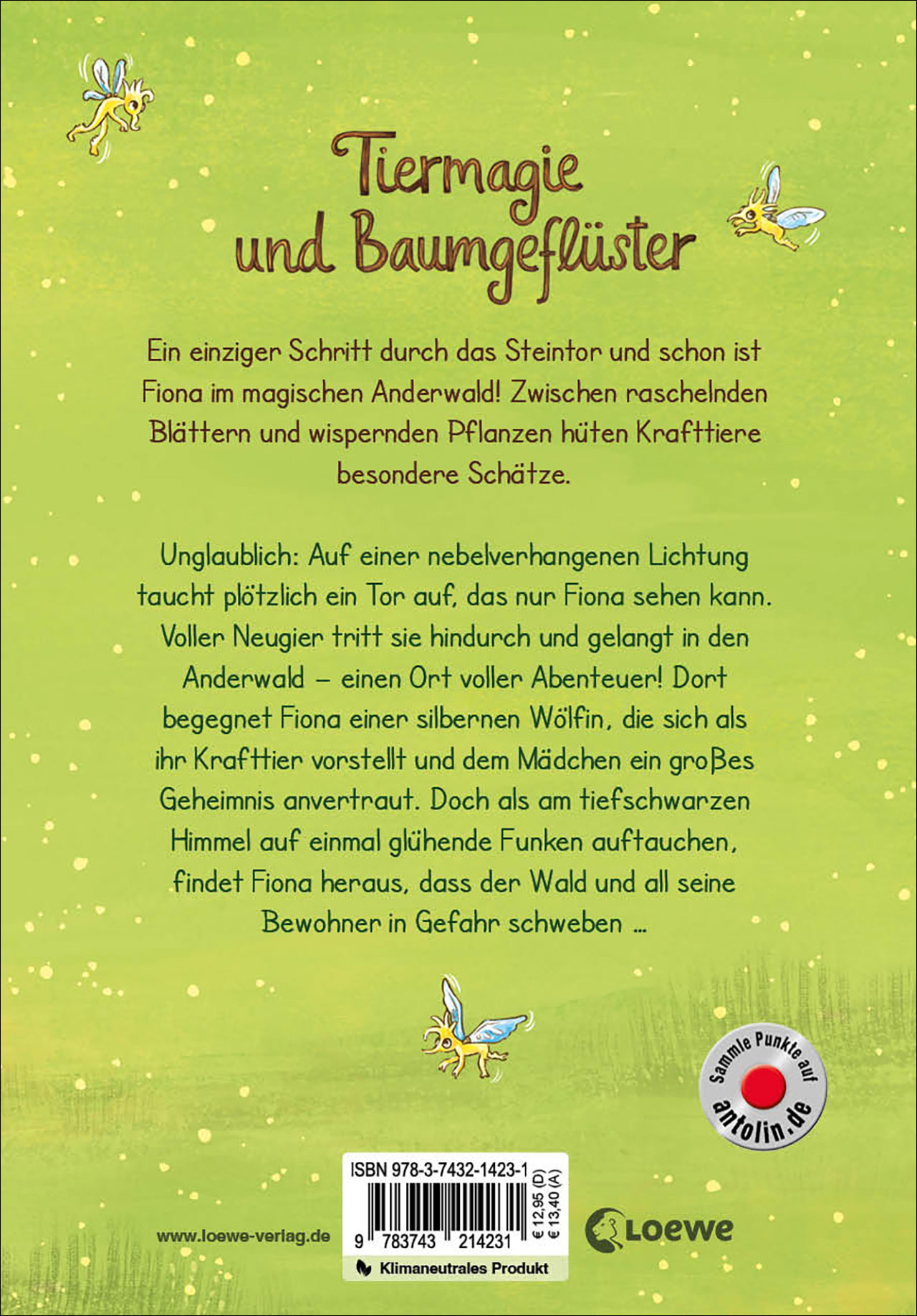 Unglaublich: Auf einer nebelverhangenen Lichtung taucht plötzlich ein Tor auf, das nur Fiona sehen kann. Voller Neugier tritt sie hindurch und gelangt in den Anderwald - einen Ort voller Abenteuer! Dort begegnet Fiona einer silbernen Wölfin, die sich als ihr Krafttier vorstellt und dem Mädchen ein großes Geheimnis anvertraut. Doch als am tiefschwarzen Himmel auf einmal glühende Funken auftauchen, findet Fiona heraus, dass der Wald und all seine Bewohner in Gefahr schweben ...