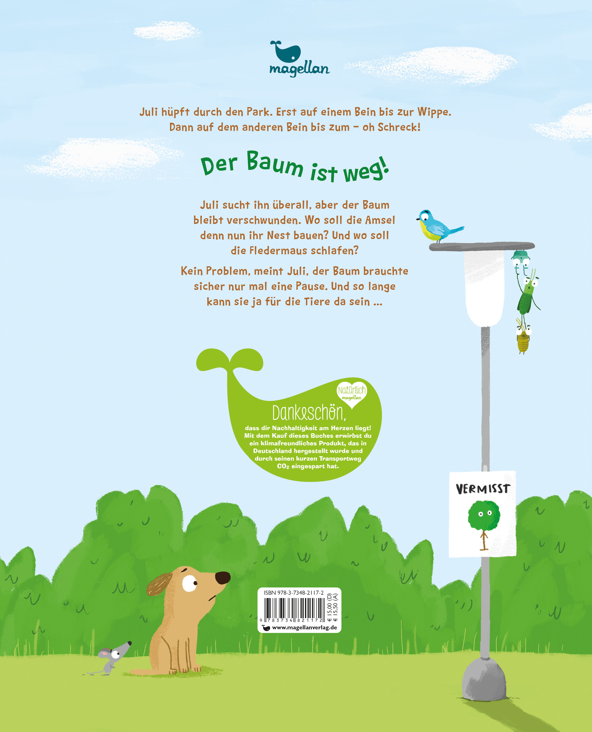 Juli hüpft durch den Park. Erst auf einem Bein bis zur Wippe. Dann auf dem anderen Bein bis zum ... oh Schreck! Der Baum ist weg! Juli sucht ihn überall, aber der Baum bleibt verschwunden. Wo soll die Amsel denn nun ihr Nest bauen? Und wo soll die Fledermaus schlafen?