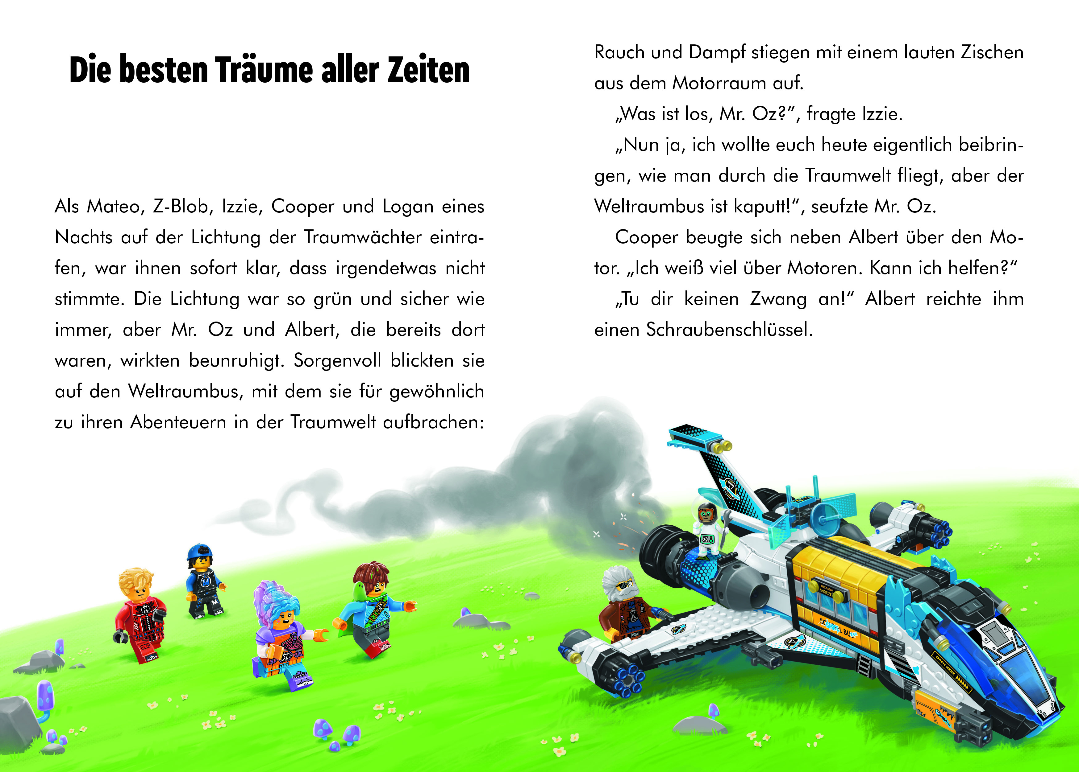 Während man nach einer erholsamen Nacht aufwacht und meist nicht mehr weiß, von was man geträumt haben, erleben die Freunde Mateo, Izzie, Cooper, Zoey und Logan in der Traumwelt aufregende Abenteuer. Drei abwechslungsreiche Geschichten bringen jungen Lesern die Figuren aus der Welt von LEGO® DREAMZzz™ näher. Während Cooper und Mr. Oz sich an die Reparatur des Weltraumbusses machen, gehen die Freunde Mateo, Izzy, Z-Blob und Logan auf eine Erkundungstour und geraten dabei auf Abwege. Im Schattenturm sind die Albgnome Susan, Snivel und Sneak auf der Suche nach der Fantasie schlafender Kinder. Und nachdem Izzy Zoey einen Überraschungsbesuch voller Glitzer abstattet, geraten die beiden in ernsthafte Gefahr.