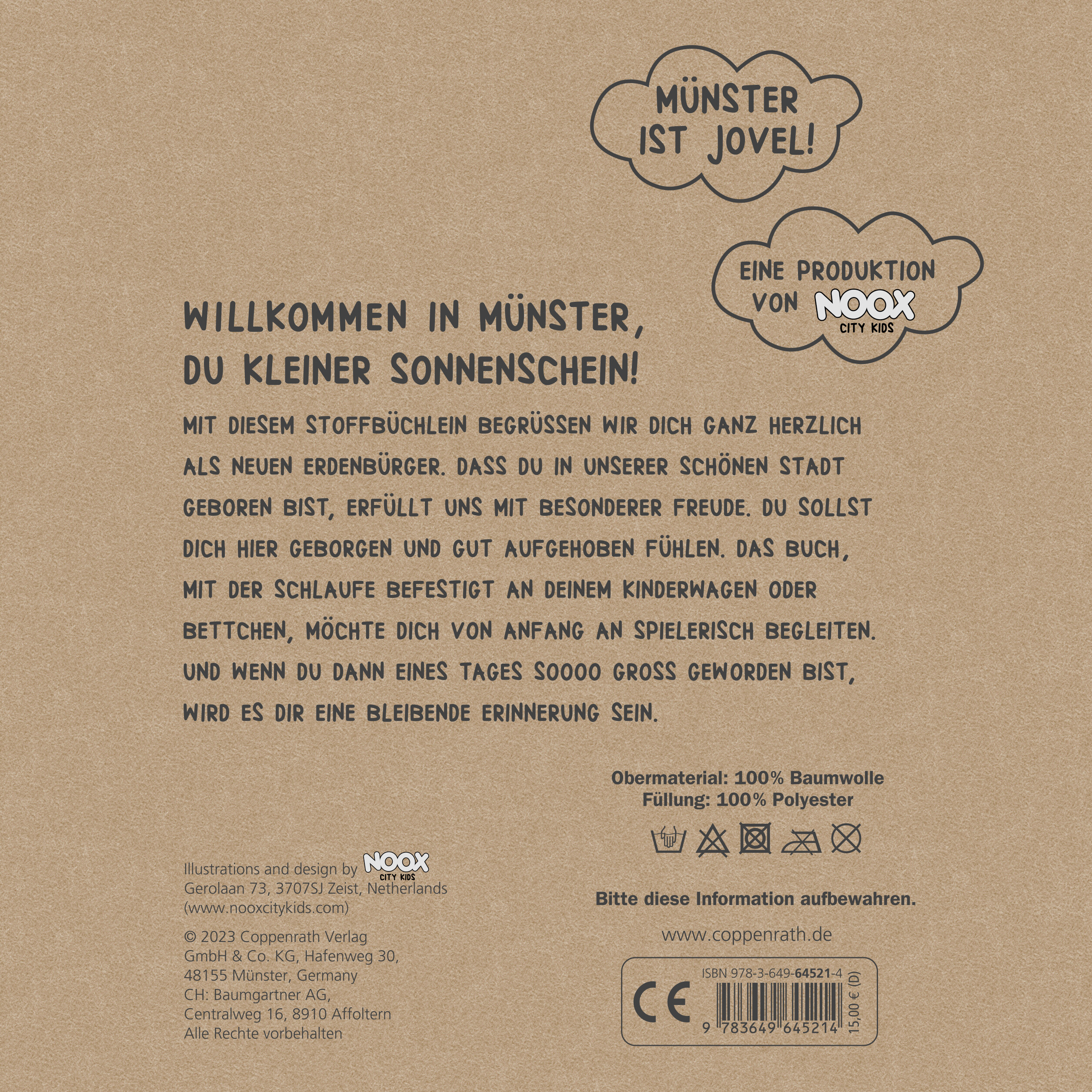 Das Stoffbuch mit Aufhängung zeigt in fröhlichen Farben die Wahrzeichen Münsters: Vom Prinzipalmarkt über den Wochenmarkt bis zum Aasee. Für alle kleinen Münsteraner, alle Kinder von Wahl- oder Exil-Münsteranern und alle echten Münster-Fans!