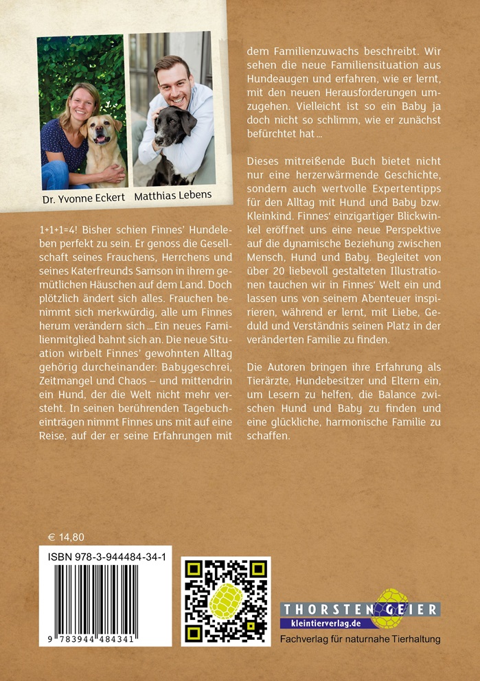 1+1+1=4! Bisher schien Finnes' Hundeleben perfekt zu sein. Er genoss die Gesellschaft seines Frauchens, Herrchens und seines Katerfreunds Samson in ihrem gemütlichen Häuschen auf dem Land. Doch plötzlich ändert sich alles. Frauchen benimmt sich merkwürdig, alle um Finnes herum verändern sich... Ein neues Familienmitglied bahnt sich an. Die neue Situation wirbelt Finnes' gewohnten Alltag gehörig durcheinander: Babygeschrei, Zeitmangel und Chaos – und mittendrin ein Hund, der die Welt nicht mehr versteht. In seinen berührenden Tagebucheinträgen nimmt Finnes uns mit auf eine Reise, auf der er seine Erfahrungen mit dem Familienzuwachs beschreibt. Wir sehen die neue Familiensituation aus Hundeaugen und erfahren, wie er lernt, mit den neuen Herausforderungen umzugehen. Vielleicht ist so ein Baby ja doch nicht so schlimm, wie er zunächst befürchtet hat...