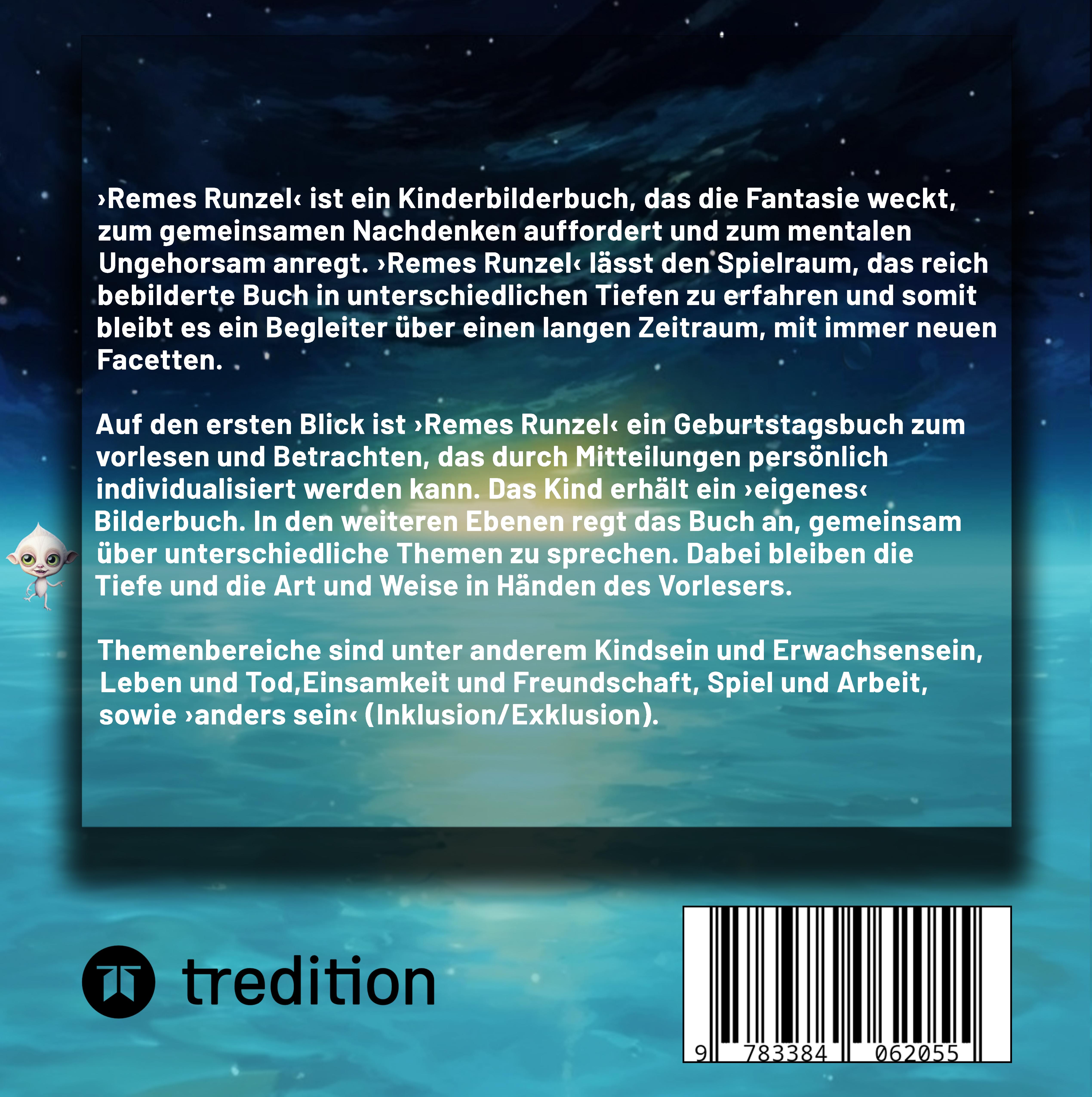 Hintergrund:'Remes Runzel' ist ein Kinderbilderbuch, das die Fantasie weckt, zum gemeinsamen Nachdenken auffordert und zum mentalen Ungehorsam anregt. 'Remes Runzel' lässt den Spielraum, das Buch in unterschiedlichen Tiefen zu erfahren und somit bleibt es ein Begleiter über einen langen Zeitraum, mit immer neuen Facetten. Transportiert wird die Geschichte von Remes Runzel, dem Geschöpf, das Lebewesen älter werden lässt, durch die tiefgründigen und emotionalen Illustrationen Nathan Herz'. In seiner Arbeit liegt eine Weisheit, die Worte nicht erfassen können.Oberflächlich betrachtet ist 'Remes Runzel' ein Geburtstagsbuch zum Vorlesen und Betrachten, das durch Mitteilungen persönlich individualisiert werden kann. Das Kind erhält ein 'eigenes' Bilderbuch. Die Schenkenden setzen sich mit dem Moment des Schenkens auseinander, um eine 'Nachricht für die Ewigkeit' in dem Buch zu schaffen.In den weiteren Ebenen regt das Buch an über unterschiedliche Themen mit dem Kind zu sprechen. Dabei bleiben die Tiefe und die Art und Weise in Händen des Vorlesers. Themenbereiche sind unter anderem Kindsein und Erwachsensein, Leben und Tod, Einsamkeit und Freundschaft, Spiel und Arbeit, sowie 'anders sein' (Inklusion/Exklusion). In diesem Zusammenhang werden im gesamten Text nicht-binäre Pronomen verwendet, die aus dem Remes Vornamen gebildet werden. Das Personalpronomen ist unspezifisch 'em', das Possessivpronomen wird zu 'emes' und das Demonstrativpronomen wird 'rem'. Somit wird selbst auf der Dimension des Textverständnisses zum Mitdenken angeregt, und hier vielleicht insbesondere auch die Vorlesenden. Auch das Thema des Genderns ist eine Frage des 'anders sein dürfen'.Inhalt:Remes ist ein Runzel, jenseits der Dimension Zeit. Remes vertreibt sich alleine die eigene Zeit. Dabei fallen Remes, mit viel Kreativität, eigene Spiele ein, mit denen Remes den Tag strukturiert. Das Runzel entscheidet sich dafür die "Anderen" zu suchen und zu ihnen zu gehen.Dort angekommen wird versucht Remes in das bestehende System einzugliedern. Es wird nicht hinterfragt, ob es sinnvoll ist, sondern es wird als gegeben angenommen. Remes Runzel nimmt sich vor, den Arbeitsauftrag anzunehmen. Nach beginnendem Eifer ist das Runzel gefangen in der Arbeit und Erholungspause, in der Kreativität keinen Raum findet. Die Kreativität bricht aus Remes hervor Das Runzel geht dem Spieltrieb nach. Letztlich zeigt sich Remes Runzel ausnahmsweise den Lesenden kurz und hat sogar eine persönliche Nachricht parat. (Dies ist der Raum für die Individualisierung, mit Namen, Text und Foto/Bild.)