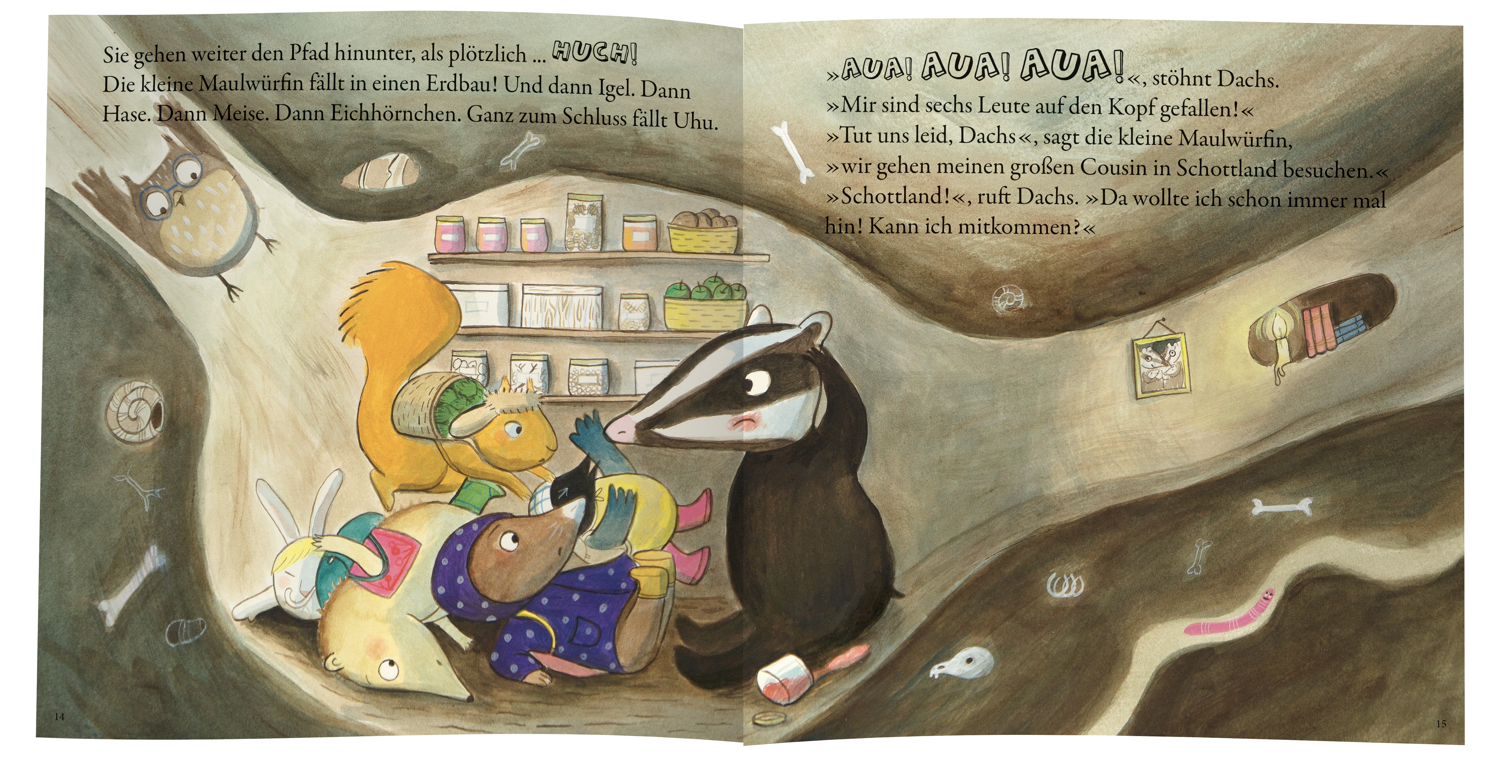 | Zusatzinfo | ie kleine Maulwürfin packt ihren Rucksack. Sie möchte ihren Cousin in Schottland besuchen. Hoppla, der Igel möchte mit. Dann sind sie zu zweit! Tapp-Tapp-Tapp – da begegnen sie dem Hasen. Ihn nehmen sie auch mit – und drei! Die Meise langweilt sich, das Eichhörnchen hat Nüsse, der Uhu will mitfliegen und der Dachs wollte schon immer nach Schottland! Und – SCHWUPPS – kommen sie zu neunt in Schottland an. Und was ist der Cousin für ein Tier? |