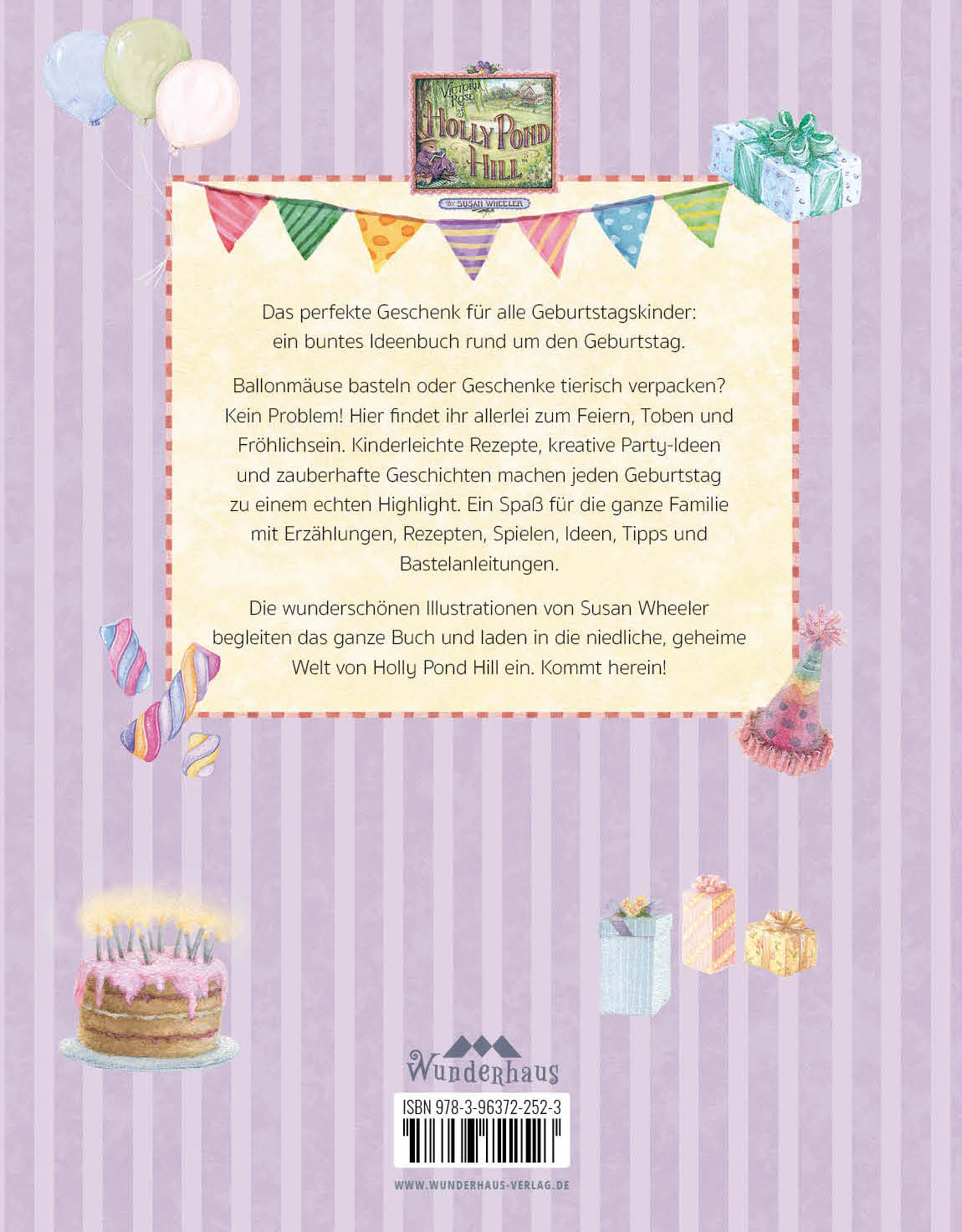 Alles für eine gelungene Geburtstagsfeier!~ Ein Lese-, Bastel- und Sachbuch über den Höhepunkt des Jahres für Kinder ab 4 Jahren~ Zur Vorbereitung auf ein tolles Geburtstagsfest mit Familie und Freunden oder im Kindergarten und Grundschule~ Einfache Anleitungen zum Basteln~ Geburtstagsspiele für drinnen und draußen~ Wunderschön nostalgisch illustriertDas perfekte Geschenk für alle Geburtstagskinder: ein buntes Ideenbuch rund um den Geburtstag.Ballonmäuse basteln oder Geschenke tierisch verpacken? Kein Problem! Hier findet ihr allerlei zum Feiern, Toben und Fröhlichsein. Kinderleichte Rezepte, kreative Party-Ideen und zauberhafte Geschichten machen jeden Geburtstag zu einem echten Highlight. Ein Spaß für die ganze Familie mit Erzählungen, Rezepten, Spielen, Ideen, Tipps und Bastelanleitungen.Die wunderschönen Illustrationen von Susan Wheeler begleiten das ganze Buch und laden in die niedliche, geheime Welt von Holly Pond Hill ein. Kommt herein!