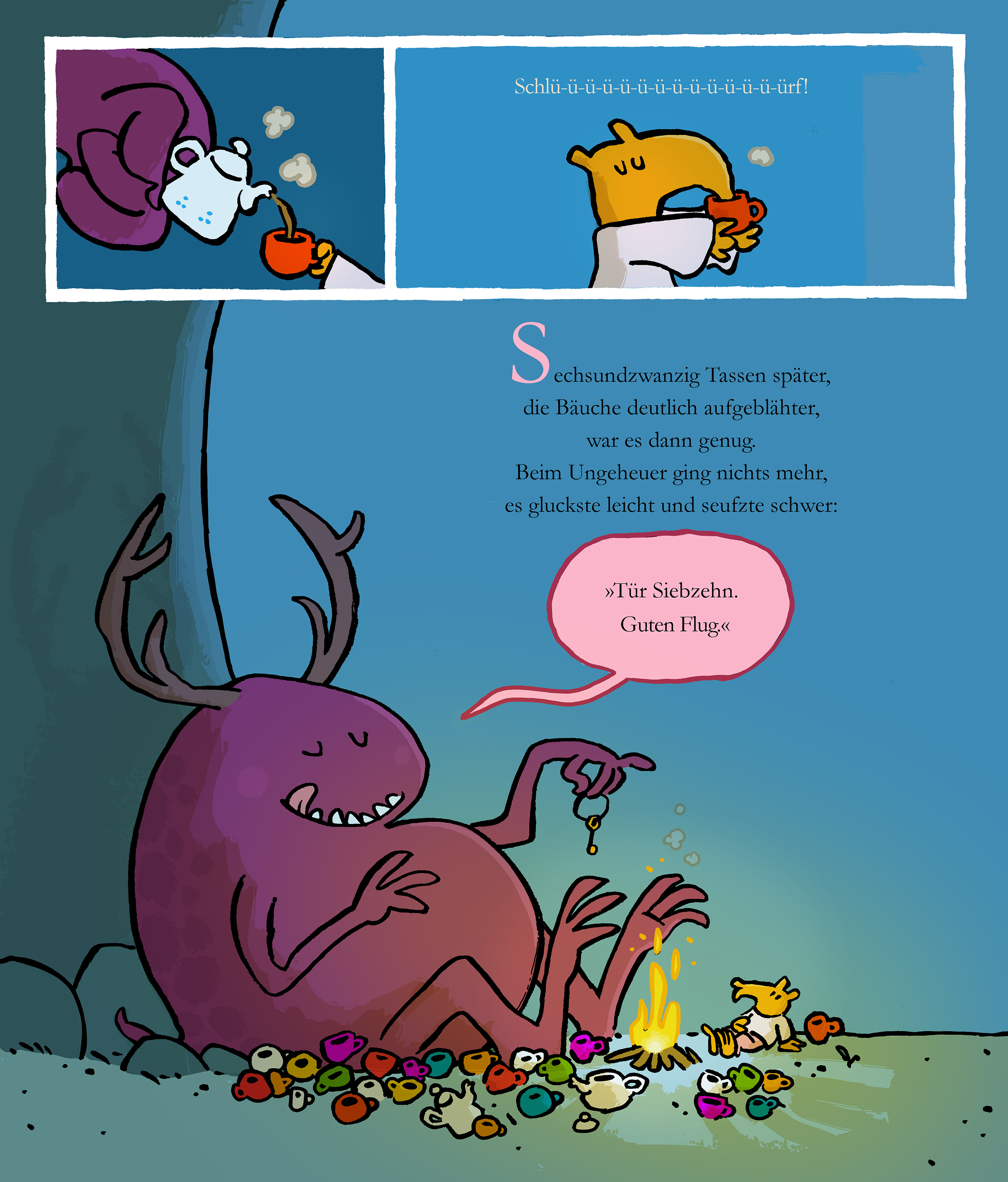 „Schluß für heute! Schlafenszeit!“ ZYX ist dafür nicht bereit. Es will lieber Abenteuer! Riesen, Otter, Ungeheuer, Pizzaberge, Krokodile, Piraten, Türen (davon viele). Es fliegt zum Dschungel, fährt zur See und rückwärts durch das ABC.