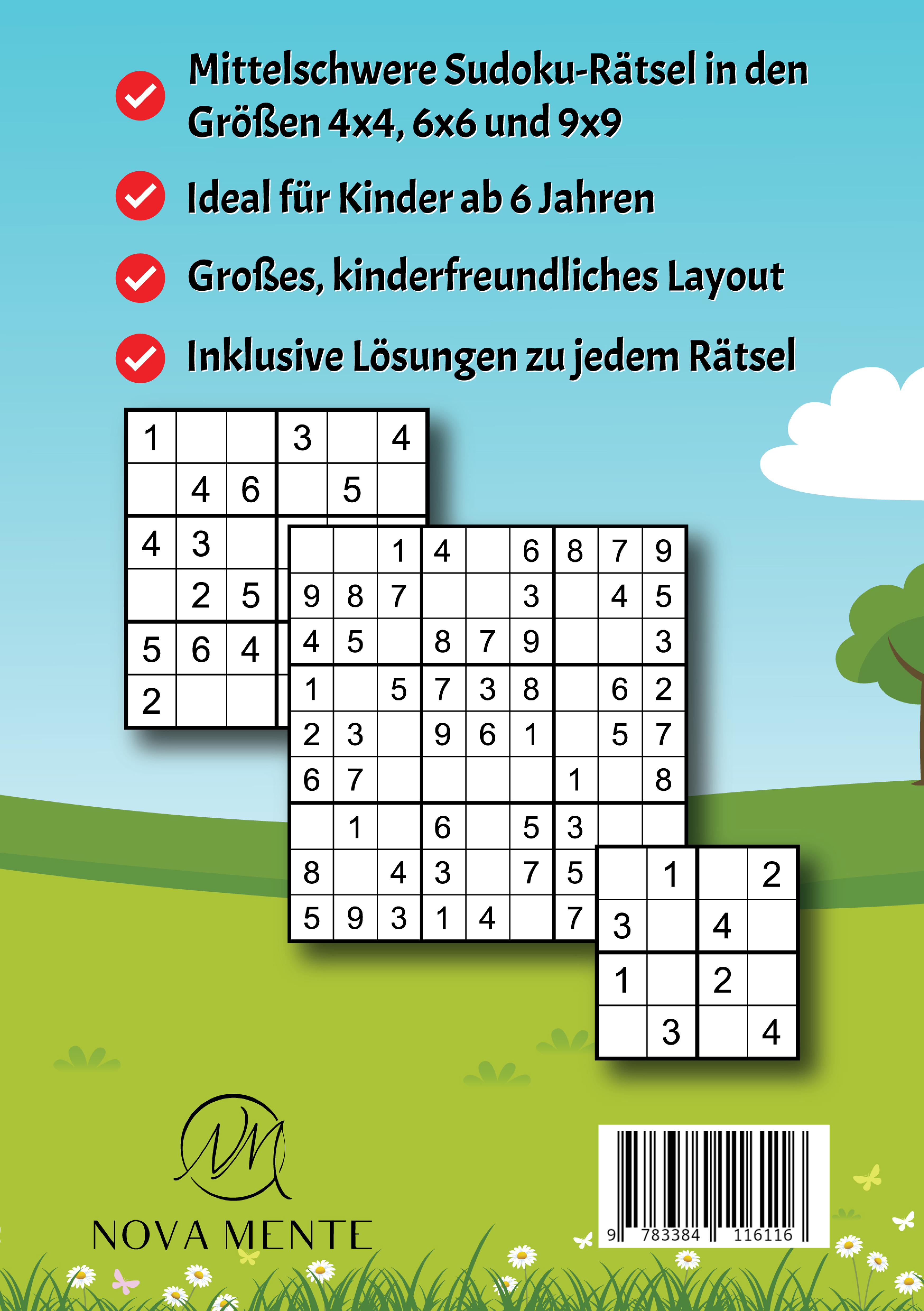 Genieße mit Deinem Kind spannende Stunden voller Rätselspaß beim Sudoku-Lösen!Dieses Rätselheft mit brandneuen Sudokus, ideal für Kinder ab 6 Jahren, bietet eine unterhaltsame und lehrreiche Möglichkeit, wichtige Fähigkeiten spielerisch zu entwickeln.Was dieses Buch so einzigartig macht:250 mittelschwere Rätsel: Eine große Auswahl von 4x4, 6x6 und 9x9 Sudokus, speziell für junge Rätselfans. Jedes Sudoku ist darauf ausgelegt, die Fähigkeiten Deines Kindes schrittweise zu verbessern und dabei den Spaß am Tüfteln zu fördern.Inklusive kostenloser Sudokus zum Ausdrucken: Auf der ersten Seite findest Du einen Link, über den Du zusätzliche Sudokus speziell für Kinder kostenlos herunterladen und ausdrucken kannst.Hohe Druckqualität: Gedruckt auf hochwertigem und umweltfreundlichem Papier, das auch häufigem Blättern standhält und ein angenehmes Rätselerlebnis ermöglicht. Ein Rätselblock, der sowohl für Dein Kind als auch für den Planeten gut ist.Unterstützung des eigenständigen Lernens: Mit den beigefügten Lösungen kann Dein Kind selbstständig üben und seine Ergebnisse überprüfen, was das Selbstvertrauen und die Unabhängigkeit stärkt.Entwicklung grundlegender Fähigkeiten: Das Lösen der Sudokus verbessert Schlüsselqualifikationen wie logisches Denken, Konzentration und Geduld - wichtige Fertigkeiten für die schulische und persönliche Entwicklung.Ideal für jede Gelegenheit: Perfekt für lange Autofahrten, Regentage oder als Freizeitbeschäftigung. Dieses Rätselbuch bietet überall und jederzeit spannende und wertvolle Unterhaltung.Ergreife jetzt die Gelegenheit, Deinem Kind mit diesem einzigartigen Sudoku Buch eine Freude zu bereiten. Es ist der ideale Weg, um die Freizeit sinnvoll zu nutzen!