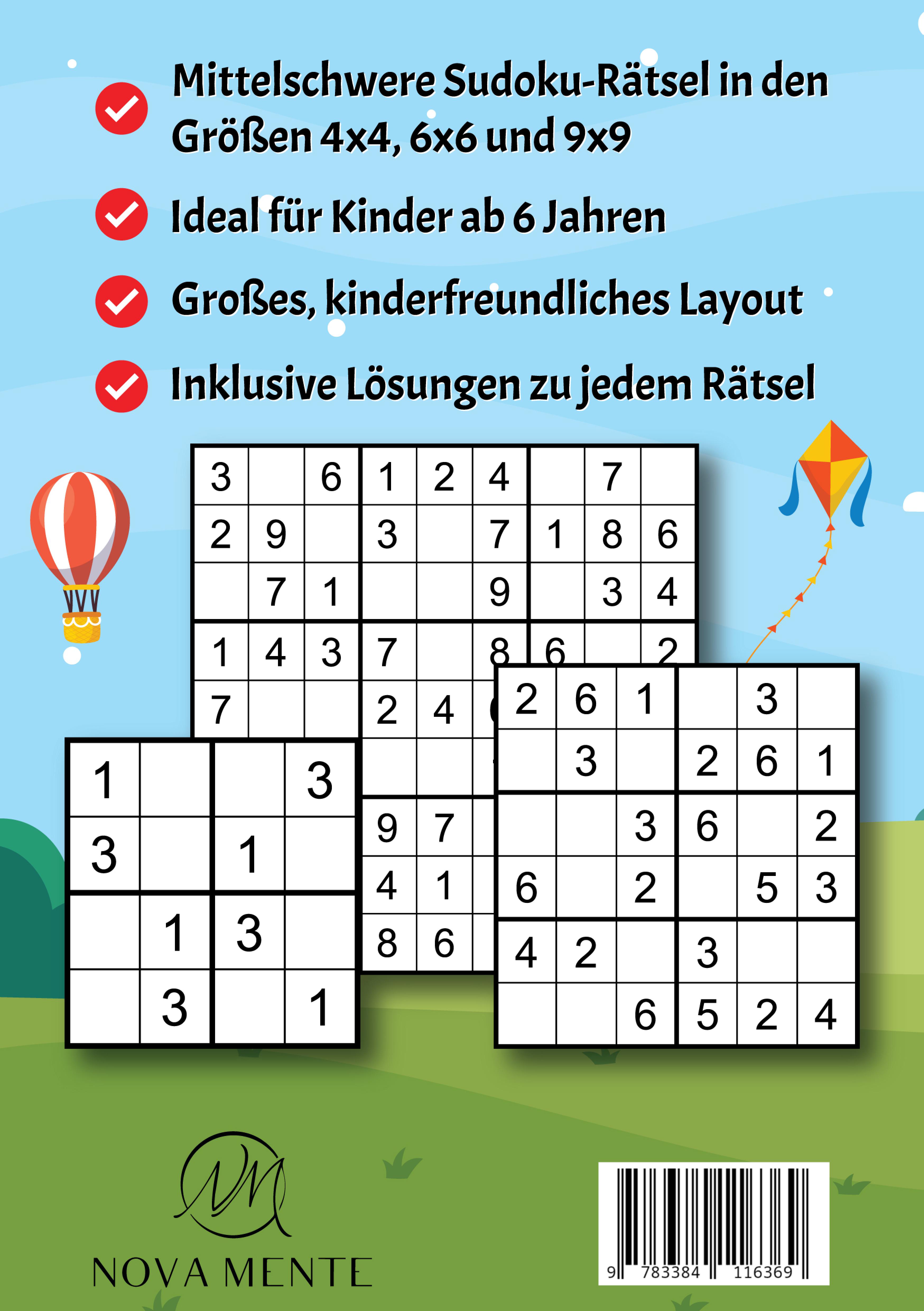 250 mittelschwere Sudokus in den Größen 4x4, 6x6 und 9x9 mit Lösungen. Ideal, um spielerisch das logische Denken und die Konzentration zu fördern.