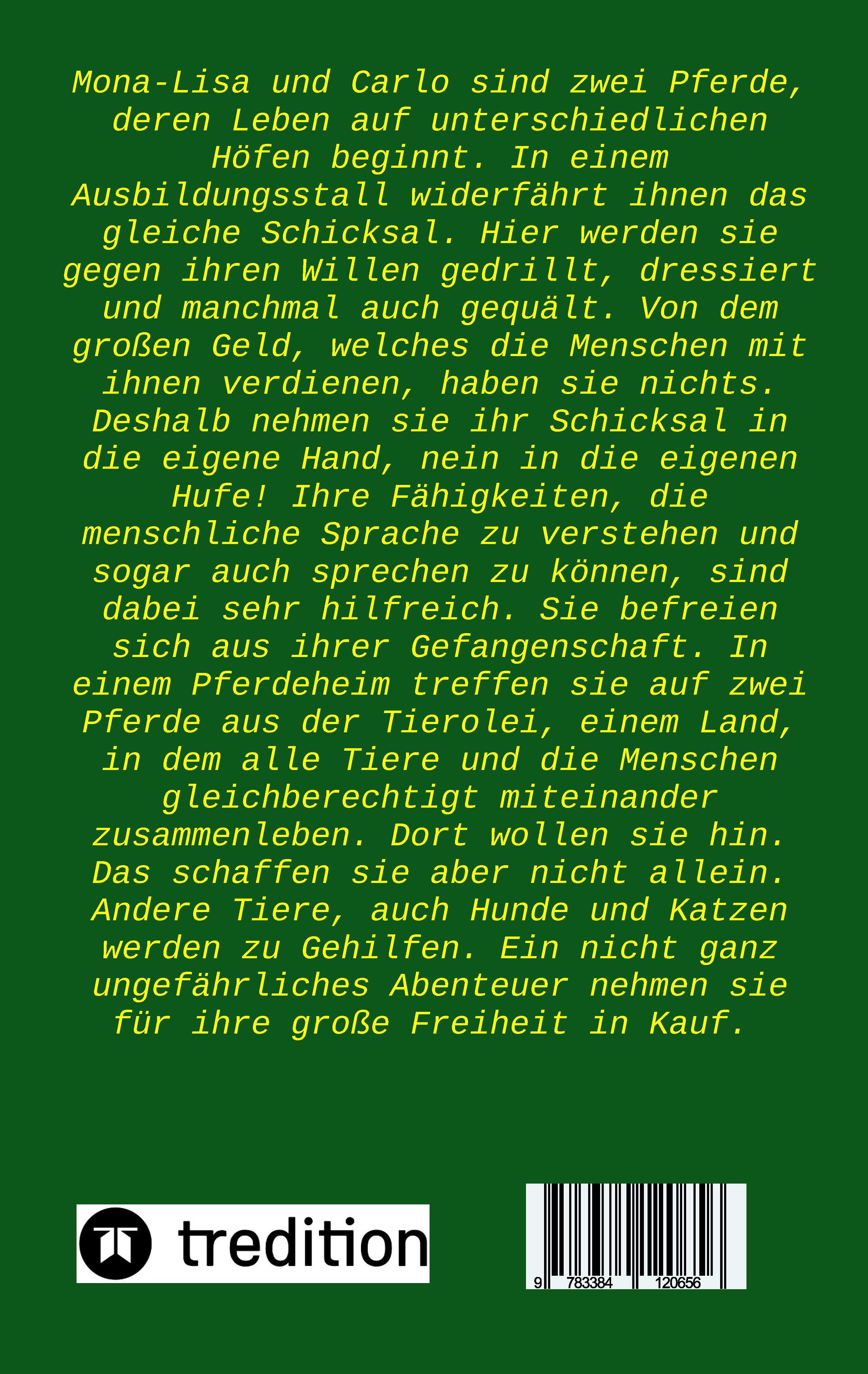 Mona-Lisa und Carlo sind zwei Pferde, deren Leben auf unterschiedlichen Höfen beginnt. In einem Ausbildungsstall widerfährt ihnen das gleiche Schicksal. Hier werden sie gegen ihren Willen gedrillt, dressiert und manchmal auch gequält. Von dem großen Geld, welches die Menschen mit ihnen verdienen, haben sie nichts. Deshalb nehmen sie ihr Schicksal in die eigene Hand, nein in die eigenen Hufe! Ihre Fähigkeiten, die menschliche Sprache zu verstehen und sogar auch sprechen zu können, sind dabei sehr hilfreich. Sie befreien sich aus ihrer Gefangenschaft. In einem Pferdeheim treffen sie auf zwei Pferde aus der Tierolei, einem Land, in dem alle Tiere und die Menschen gleichberechtigt miteinander zusammen leben. Dort wollen sie hin. Das schaffen sie aber nicht allein. Andere Tiere, auch Hunde und Katzen werden zu Gehilfen. Ein nicht ganz ungefährliches Abenteuer nehmen sie für ihre große Freiheit in Kauf.
