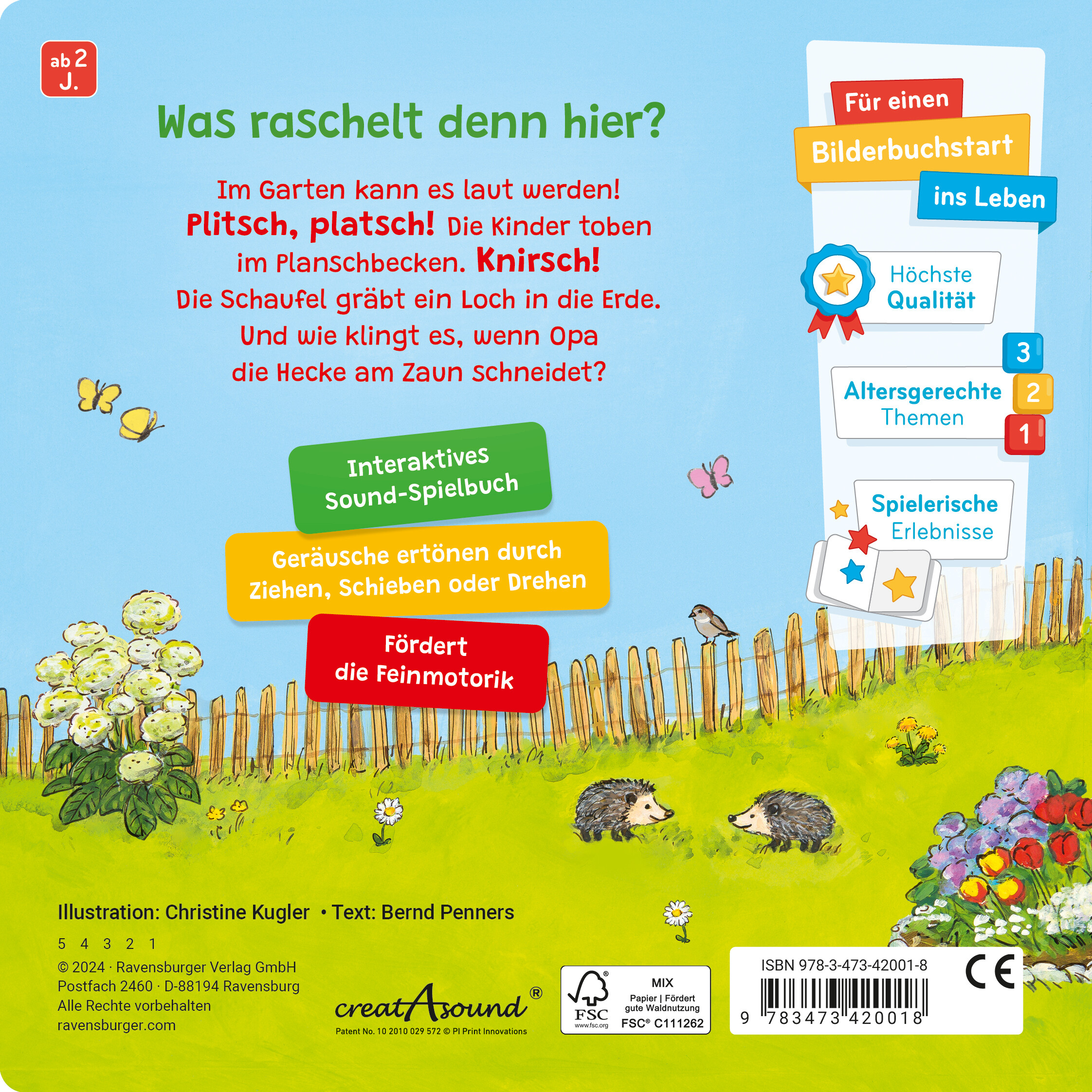 Was raschelt denn hier? Im Garten kann es laut werden. Knirsch! Die Gartenschaufel gräbt ein tiefes Loch in die Erde. Das Wasser plätschert aus dem Gartenschlauch und raschelnd sammelt der Rechen das Laub ein. In diesem innovativen Sound-Spielbuch können allein durch Bewegung von leichtgängigen Schiebe-Elementen Geräusche selbst erzeugt werden. Wird der Schieber schnell bewegt, klingt das Geräusch anders als bei langsamer Bewegung. Funktioniert ganz ohne Batterien. Die Bücher der "Spielen, Hören, Staunen"-Reihe sind Soundbücher der besonderen Art: Sie kommen komplett ohne Elektronik oder Batterien aus, da allein durch die Bewegung von Schiebe-Elementen auf den Seiten verschiedenste Geräusche erzeugt werden können. Bereits kleine Kinderhände können die Schieber bewegen. So garantieren diese Bücher unendlichen Geräusche-Spiel-Spaß für Kinder ab 2 Jahren!