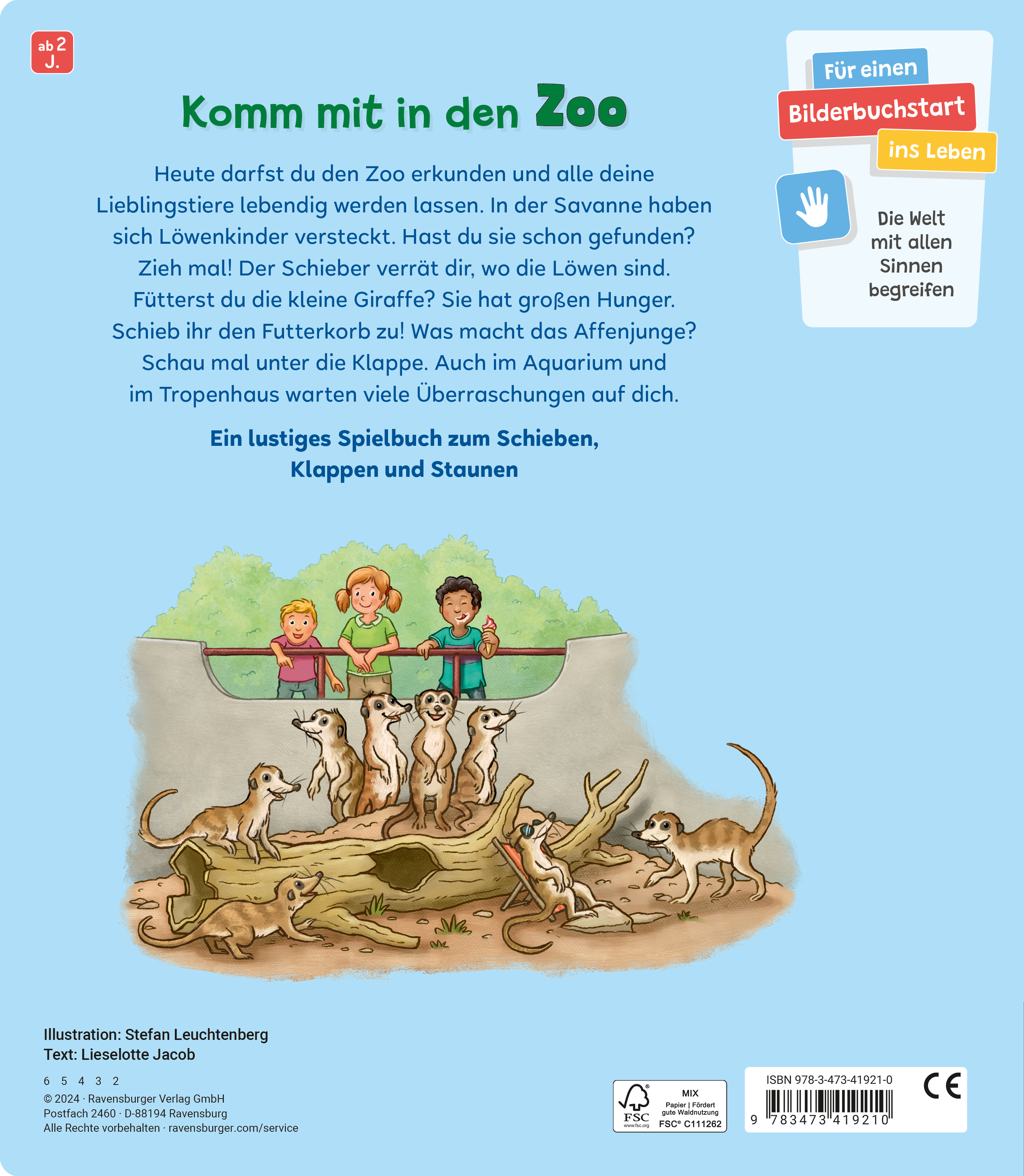 Interaktives Pappbilderbuch mit Schiebern und Klappen ab 2 Jahren Im Zoo ist was los! Viele Tiere warten auf dich. Als Erstes geht's in das Savannengehege, danach ins Aquarium und zum Schluss ins Tropenhaus. Leichtgängige Schieber und viele Klappen bieten zusammen mit kurzen Vorlesetexten jede Menge Spielspaß. Die kleine Giraffe kommt allein nicht an den Korb mit dem Heu. Schieb mal! Die Robben wollen spielen! Wirfst du ihnen den Ball zu? Abwechslungsreiche Szenen und spannende Spieleffekte lassen dieses Buch zum Lieblingsbuch werden! Die bekanntesten und beliebtesten Zootiere in einem interaktiven Spielbuch für kleine Tierfans. Auf jeder Seite lassen sich Szenen verändern und Tiere bewegen. Affen, Löwen, Erdmännchen, Clownfische, Giraffen dürfen gestreichelt und gefüttert werden. Im Tropenhaus wartet ein besonderes Highlight: Ein Boot mit Zoobesuchern lässt sich durchs Wasser schieben. Die spannenden Schieber sind stabil und damit perfekt für kleine Kinderhände. Und auch hinter den Klappen stecken viele Überraschungen: Was macht der Tintenfisch im Aquarium? Und wo sind die Löwenkinder versteckt? Findet es heraus!