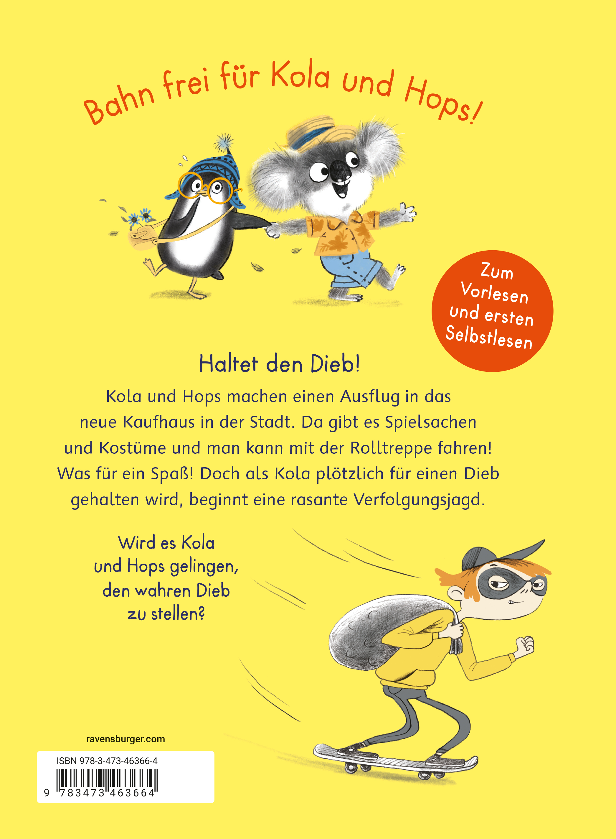 Bahn frei für Kola und Hops! Heute möchte Kola mit Hops in die Stadt zur Kaufhauseröffnung. Da gibt es Spielsachen und Kostüme und man kann mit der Rolltreppe fahren - das reinste Paradies für Kola! Hops findet das zwar viel zu gefährlich, aber er kann seinem besten Freund einfach keinen Wunsch ausschlagen. Und so stürzen sich die beiden ins Abenteuer. Doch Kola wird plötzlich für einen Dieb gehalten und es beginnt eine rasante Verfolgungsjagd durch die Stadt. Wird es Kola und Hops gelingen, den wahren Dieb zu stellen? Während der quirlige Koalabär Kola jeden Tag neue Ideen für aufregende Unternehmungen hat, würde sein bester Freund, der vorsichtige und vernünftige Pinguin Hops, es sich viel lieber in ihrem Baumhaus gemütlich machen. Doch weil sie beste Freunde sind, begleitet Hops Kola natürlich bei jedem Abenteuer, auch wenn es meist nicht lange dauert, bis sie aus Versehen in Schwierigkeiten geraten. Aber zusammen finden sie immer einen Ausweg. Ein einfacher Text und zahlreiche große Illustrationen erzählen mit viel Witz die Abenteuer der beiden Helden. Die Geschichten eignen sich nicht nur zum Vorlesen für Kindergarten- und Vorschulkinder, sondern auch zum ersten Selbst- oder Mitlesen.