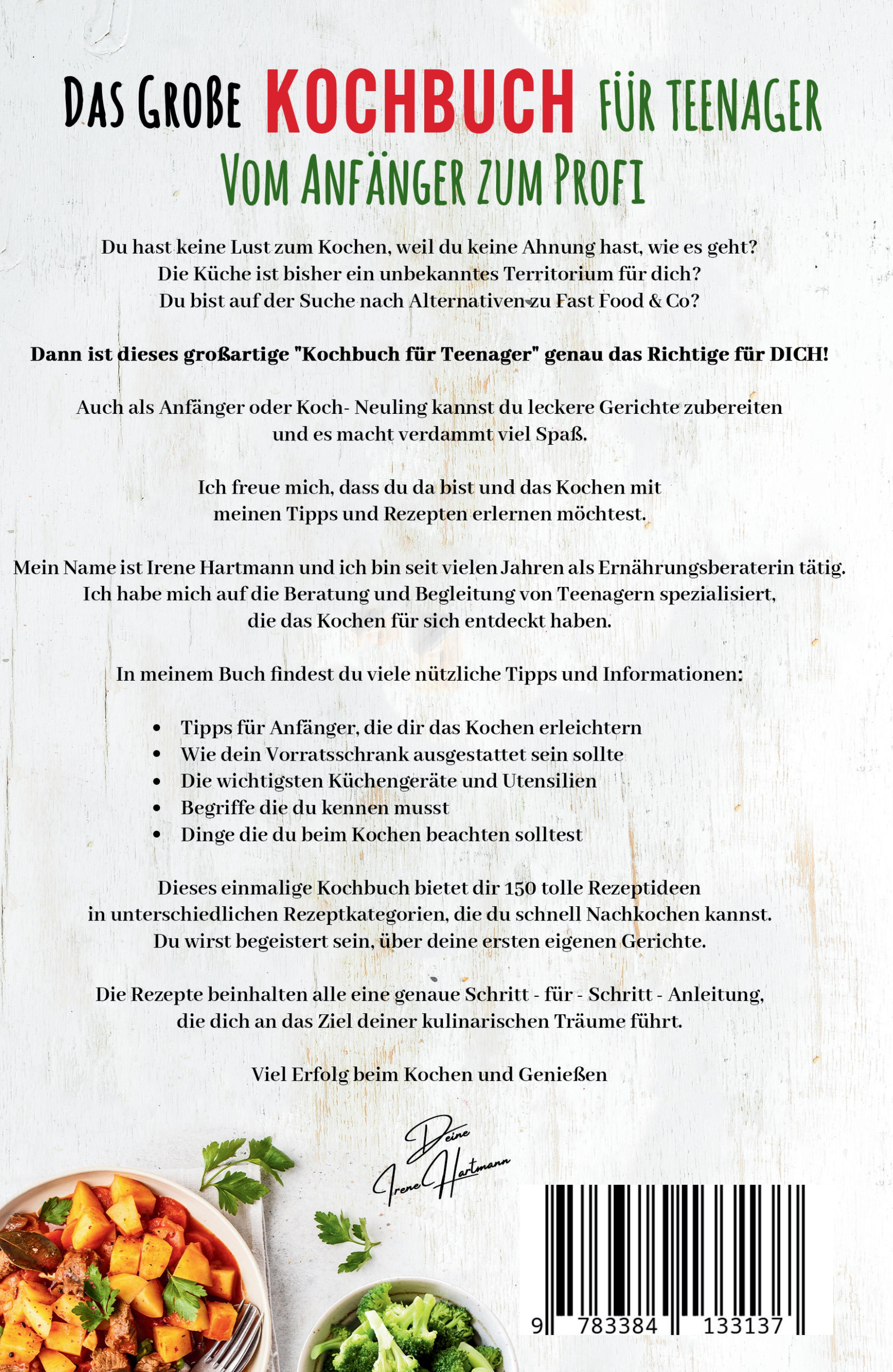 "Das große Kochbuch für Teenager" ist dein perfekter Start in die Welt des Kochens. Wenn du bisher wenig Erfahrung in der Küche hast oder auf der Suche nach gesunden Alternativen zu Fast Food bist, bietet dieses Buch genau das, was du brauchst. Dieses Kochbuch ist ideal für junge Leute, die das Kochen von Grund auf lernen und ihre Ernährungsgewohnheiten verbessern möchten.In diesem Buch begleitet dich Irene Hartmann, eine erfahrene Ernährungsberaterin, die sich auf die Bedürfnisse von Teenagern spezialisiert hat. Sie führt dich durch die Grundlagen des Kochens und zeigt dir, wie du einfache, aber köstliche Mahlzeiten zubereiten kannst. Von der Ausstattung deines Vorratsschranks bis hin zu den wichtigsten Küchengeräten und -utensilien - hier lernst du alles, was du für den Start brauchst."Das große Kochbuch für Teenager" präsentiert dir 150 vielfältige Rezeptideen aus verschiedenen Kategorien, alle leicht nachzukochen und ideal für den jugendlichen Geschmack. Die Rezepte sind mit genauen Schritt-für-Schritt-Anleitungen versehen, sodass du auch als Anfänger problemlos leckere Gerichte zaubern kannst. Ob ein schnelles Frühstück, ein gesundes Mittagessen oder ein kreatives Abendessen - dieses Buch bietet für jeden Anlass und jede Mahlzeit die richtige Inspiration.Die Vorteile dieses Buches sind klar: Eine große Auswahl an Rezepten, die die kulinarische Vielfalt widerspiegeln, einfache und verständliche Anleitungen speziell für Jugendliche und Gerichte, die nicht nur gesund, sondern auch extrem lecker sind. Dazu kommen praktische Tipps und ein ausführlicher Ratgeberteil, der dir hilft, dich in der Küche zurechtzufinden. Mit Angaben zu Zubereitungszeiten und Nährwertinformationen bist du immer bestens informiert.Mach "Das große Kochbuch für Teenager" zu deinem treuen Küchenbegleiter und starte deine Reise in die Welt des Kochens. Es ist Zeit, deine Küchenfähigkeiten zu entdecken und zu zeigen, was in dir steckt!