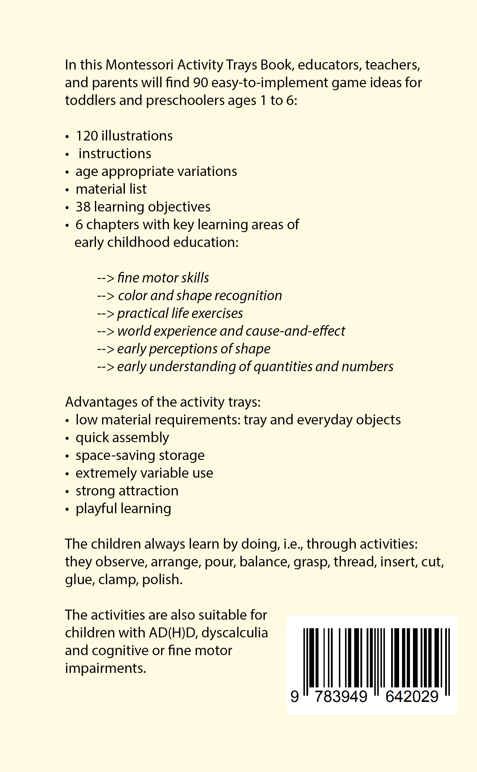 Are you a parent, educator or teacher looking for exciting activities that promote the development of your children?The activity trays based on Maria Montessori's philosophy practice key basic skills and learning areas of early childhood development:- fine motor skills- color and shape recognition- practical life exercises- world experience and cause-and-effect- early perceptions of shape- early understanding of quantities and numbers Advantages of the activity trays:- low material requirements: everyday objects- quick assembly- space-saving storage- extremely variable use- strong attraction- playful learning