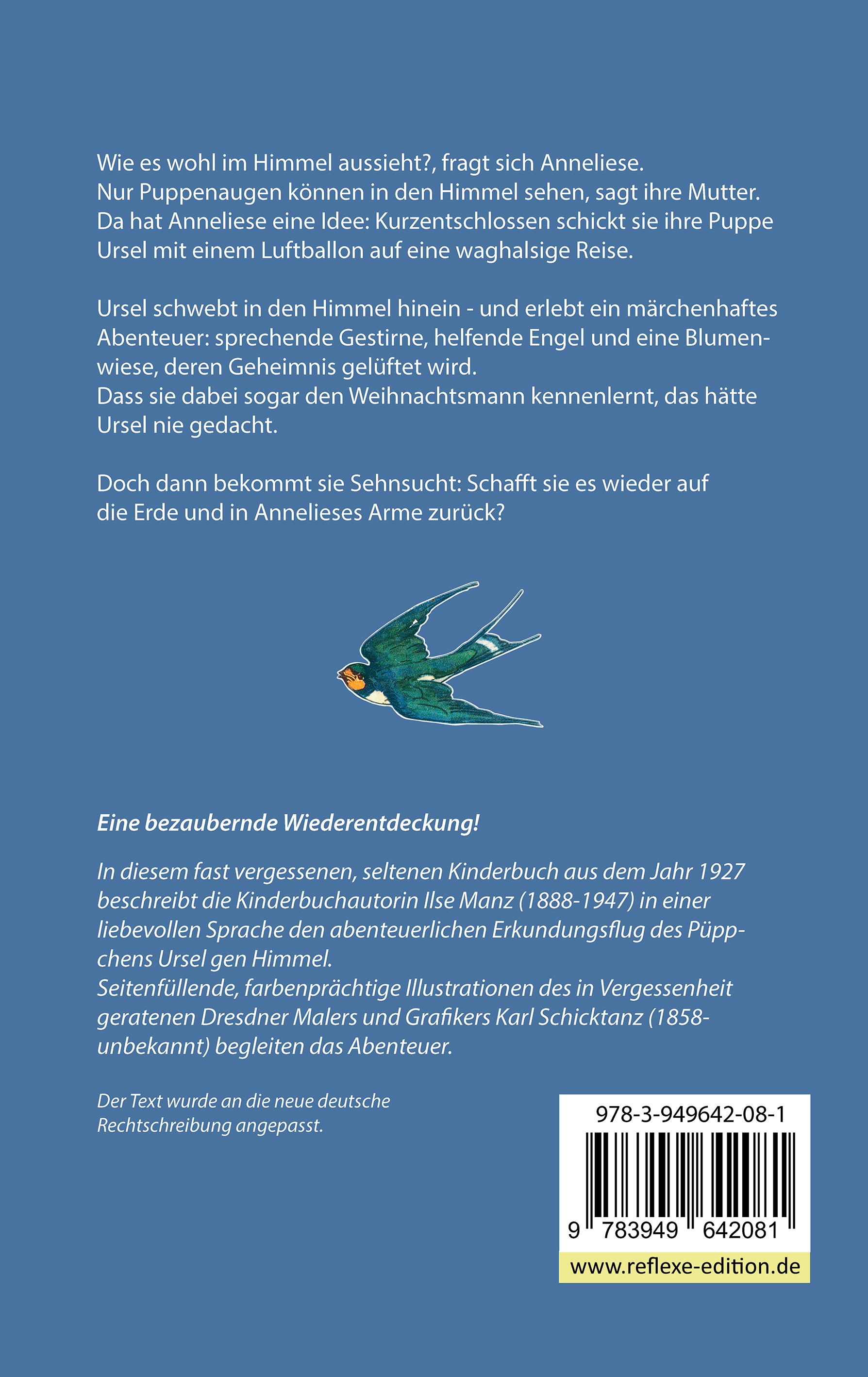 Wie es wohl im Himmel aussieht?, fragt sich Anneliese.Nur Puppenaugen können in den Himmel sehen, sagt ihre Mutter. Da hat Anneliese eine Idee: Kurzentschlossen schickt sie ihre Puppe Ursel mit einem Luftballon auf eine waghalsige Reise.Ursel schwebt in den Himmel hinein - und erlebt ein märchenhaftes Abenteuer: wütende Stürme, sprechende Gestirne, die den Weg weisen, helfende Engel und eine Blumenwiese, deren Geheimnis gelüftet wird.Dass sie dabei sogar den Weihnachtsmann kennenlernt, das hätte Ursel nie gedacht.Doch dann bekommt sie Sehnsucht: Schafft sie es wieder auf die Erde und in Annelieses Arme zurück?Zu Unrecht vergessenen, nun wiederentdeckt! Dieses wunderschöne, seltene Kinderbuch aus dem Jahr 1927, in einer liebevollen Sprache von der Kinderbuchautorin Ilse Manz (1888-1947) verfasst, nimmt den Leser mit auf einen abenteuerlichen Erkundungsflug des Püppchens Ursel gen Himmel.Seitenfüllende, farbenprächtige Illustrationen des in Vergessenheit geratenen Dresdner Malers und Grafikers Karl Schicktanz (1858-unbekannt) begleiten das Abenteuer.Ursprünglich waren die Illustrationen als chromolithographische Tafeln umgesetzt. Sie wurden für diese Ausgabe sorgfältig digitalisiert und die Altersspuren der antiquarischen Erstausgabe originalgetreu retuschiert.Text und Abbildungen wurden für diese neue Ausgabe aus dem Jahr 2022 originalgetreu übertragen.Der Text wurde für heutige LeserInnen an die neue deutsche Rechtschreibung angepasst.