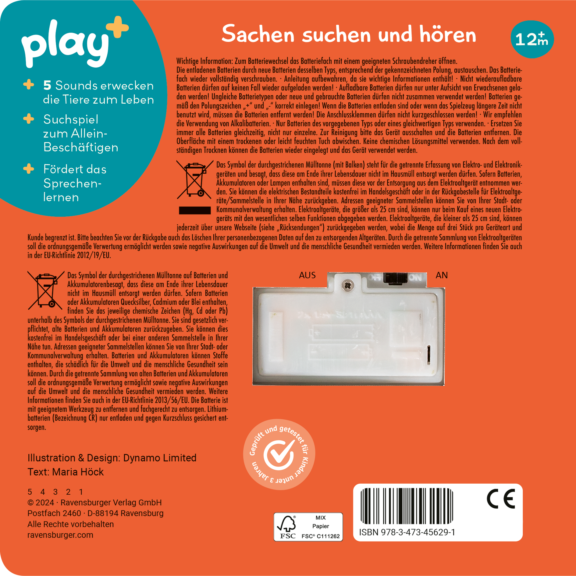 Tier-Such-Spaß mit süßen Geräuschen Wer trompetet denn da? Und wo ist das Leopardenkind? In jedem Lebensraum gibt es viele Tiere zu suchen und finden. 5 süße Geräusche machen die Entdeckungsreise durch den Ozean, den Dschungel und die heimische Weide für Kinder ab 12 Monaten noch aufregender. Dank der großen, leicht zu drückenden Knöpfe auf jeder Seite ist der Spielspaß mit diesem Buch kinderleicht und nahezu unendlich. Die liebevollen Texte und plakativen Suchbilder benennen die Tierkinder und regen die Sprachentwicklung an. Play+, die neue Baby- und Kleinkindlinie, fokussiert auf eine ganzheitliche frühkindliche Förderung – mit der gesamten Erfahrung der Marke Ravensburger. Die abwechslungsreichen Bücher und Spielzeuge von Play+ garantieren Kindern von 0-3 Jahren jede Menge Spaß und ermöglichen ein spielerisches Lernen und Entdecken – egal ob gemeinsam oder auch allein. Die Bedürfnisse der Kinder und die Anforderungen der Eltern bestimmen die Entwicklung aller Produkte. Der Blick fürs Detail, das besondere Extra und eine moderne Gestaltung machen das Programm von Play+ aus, immer unter Einhaltung der hohen Ravensburger Sicherheits- und Qualitätsansprüche. Denn sicher ist sicher.