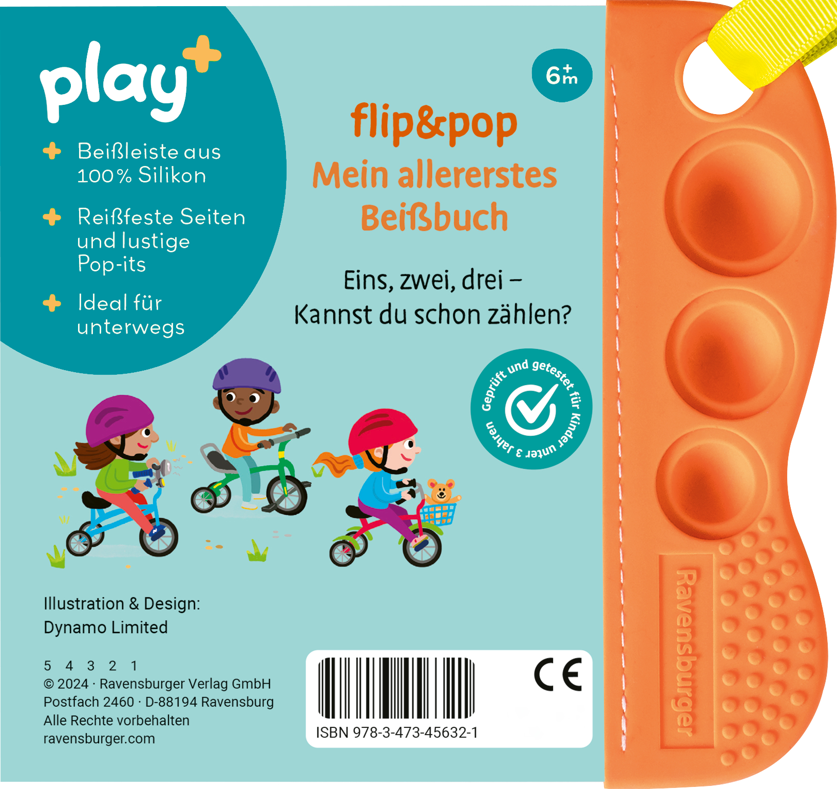 Flip&pop – Beiß- und reißfest Dieses Buch bietet mit der genoppten Silikon-Leiste großen Beiß- und Spielspaß für Babys ab 6 Monaten. Mit unzerreißbaren und wasserfesten Seiten ist das Buch nicht nur ideal für Kinderhände und der perfekte Begleiter für unterwegs, sondern beschäftigt Babys auch beim Baden. Die lustigen Pop-its laden dazu ein, die Welt mit den Händen zu erkunden und fördern ganz nebenbei spielerisch die Feinmotorik. Auf 5 kunterbunten Seiten lernen die Kleinen die ersten Zahlen von 1-5 kennen. Play+, die neue Baby- und Kleinkindlinie, fokussiert auf eine ganzheitliche frühkindliche Förderung – mit der gesamten Erfahrung der Marke Ravensburger. Die abwechslungsreichen Bücher und Spielzeuge von Play+ garantieren Kindern von 0-3 Jahren jede Menge Spaß und ermöglichen ein spielerisches Lernen und Entdecken – egal ob gemeinsam oder auch allein. Die Bedürfnisse der Kinder und die Anforderungen der Eltern bestimmen die Entwicklung aller Produkte. Der Blick fürs Detail, das besondere Extra und eine moderne Gestaltung machen das Programm von Play+ aus, immer unter Einhaltung der hohen Ravensburger Sicherheits- und Qualitätsansprüche. Denn sicher ist sicher.