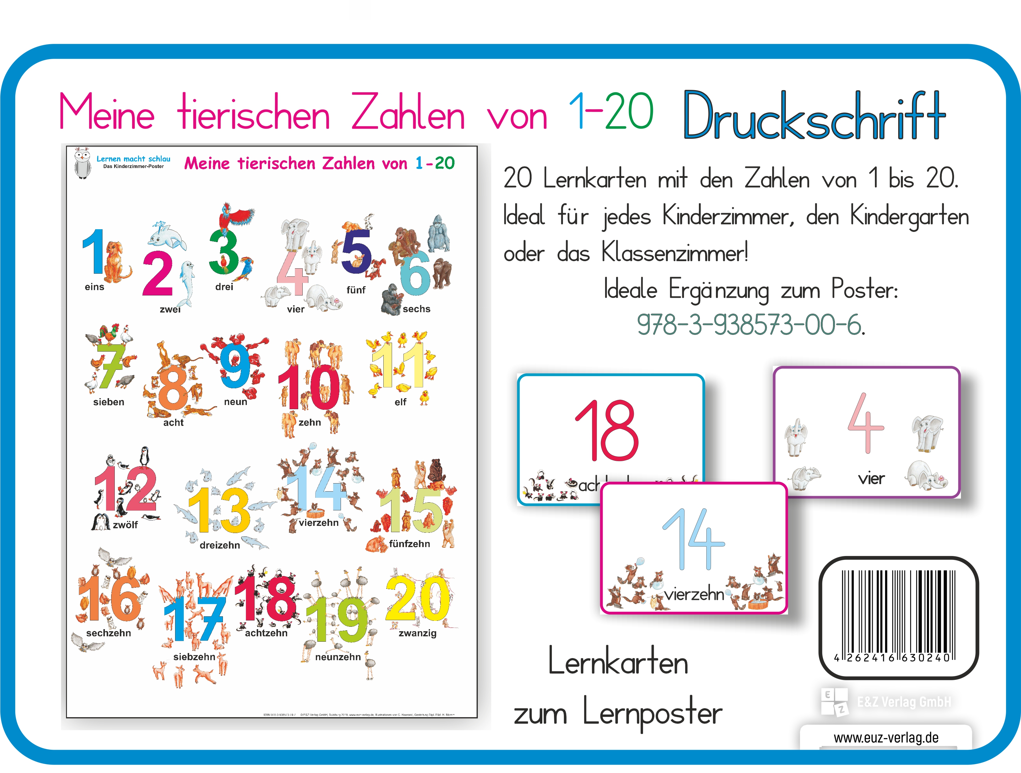 Meine tierischen Zahlen von 1-20 Druckschrift - Lernkarten DINA 520 Lernkarten mit dem Alphabet in Groß- und Kleinbuchstaben. Zu jeder Zahl gibt es ein passende Anzahl Tiere.Die Wörter sind in Druckschrift geschrieben.Ideal für Zuhause, den Kindergarten oder das Klassenzimmer.Einfache Handhabung durch das Format DINA5.Ideal für jedes Kinderzimmer, den Kindergarten oder das Klassenzimmer.So lernen Kinder die Zahlen von 1-20 kennen!Eine Ergänzung für die Bildkarten sind:- Poster 70 x 100 cm Meine tierischen Zahlen- Kartenspiel mit 60 Spielkarten