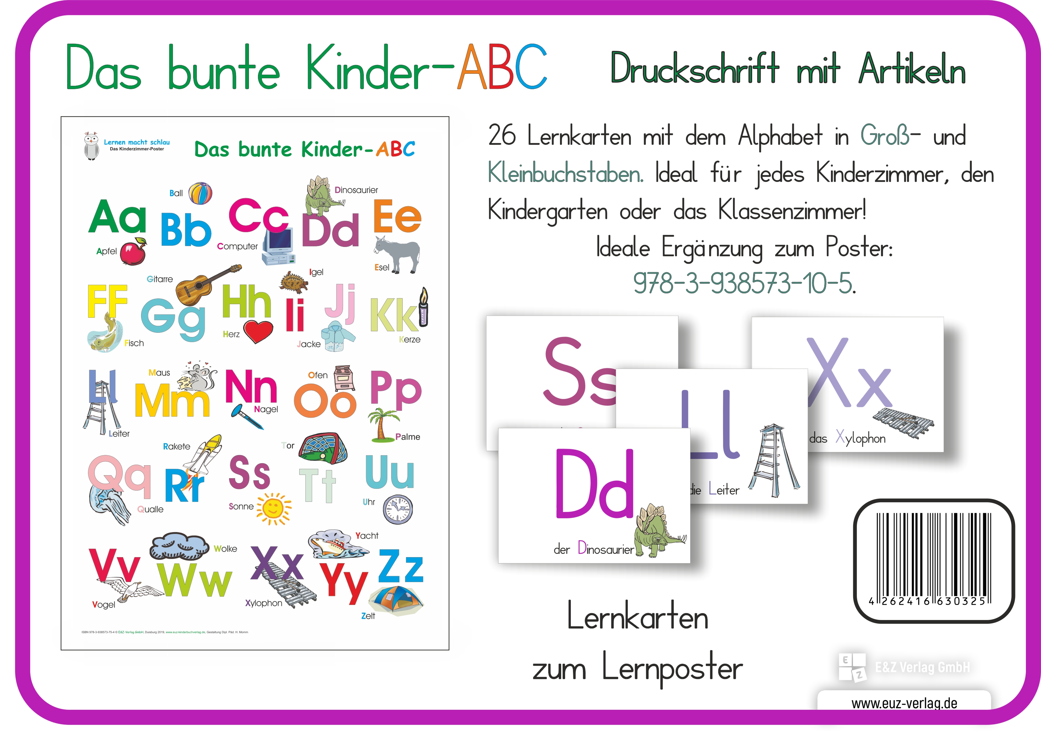 Das bunte Kinder-ABC Druckschrift mit Artikeln - Lernkarten DINA 426 Lernkarten mit dem Alphabet in Groß- und Kleinbuchstaben. Zu jedem Großbuchstaben gibt es einen passenden Begriff, der mit dem Buchstaben beginnt.Die Wörter sind in Druckschrift mit Artikeln geschrieben.Ideal für Zuhause, den Kindergarten oder das Klassenzimmer.Einfache Handhabung durch das Format DINA4.Ideal für jedes Kinderzimmer, den Kindergarten oder das Klassenzimmer.So lernen Kinder das ABC kennen!Eine Ergänzung ist unser Kartenspiel Das bunte Kinder-ABC in Druckschrift