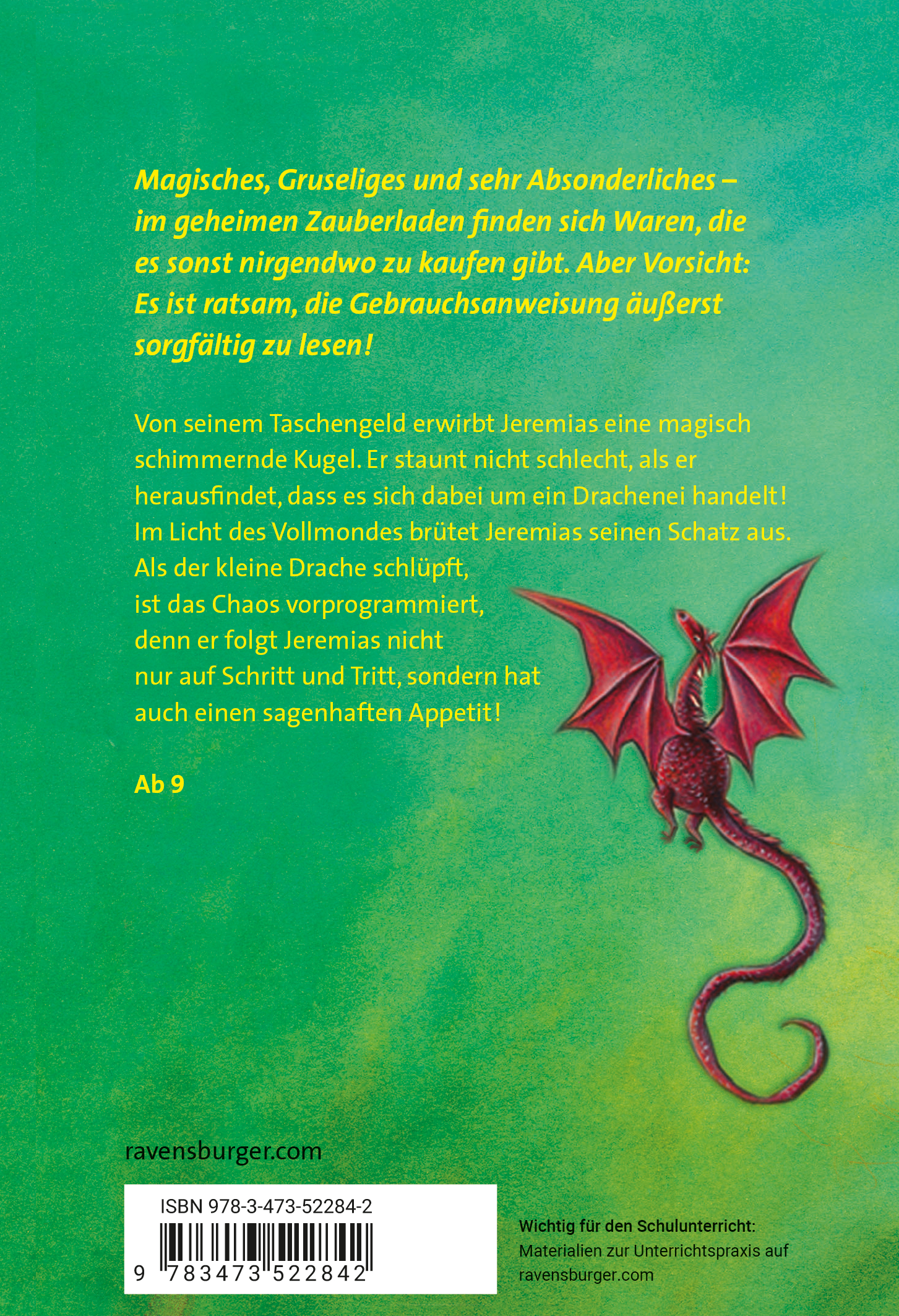 Durch einen sonderbaren Zufall gerät Jeremias in einen fantastischen Zauberladen. Dort quellen die Regale von ungewöhnlichen Dingen geradezu über, doch Jeremias hat nur Augen für eine in allen Regenbogenfarben schillernden Kugel. Diese zieht ihn so magisch an, dass er sie dem Ladenbesitzer kurzentschlossen abkauft. Von diesem Moment an verändert sich sein Leben grundlegend. Denn bei seinem Spontankauf handelt es sich keineswegs nur um eine Kugel, sondern um ein echtes Drachenei! Und aus dem schlüpft schon in der nächsten Vollmondnacht ein kleiner, roter Drache - genauer gesagt: ein Drachenweibchen. Neben der Schule und seinen verschiedenen Hobbys hat Jeremias nun eine nicht gerade leichte Aufgabe: Er muss für seine neue Freundin sorgen und sie in seinem Zimmer aufziehen. Aber was frisst ein Drache eigentlich? Wie groß wird er werden? Wie genau verständigt man sich mit so einem Fabelwesen? Und kann Jeremias die Existenz des Drachen wirklich geheim halten?