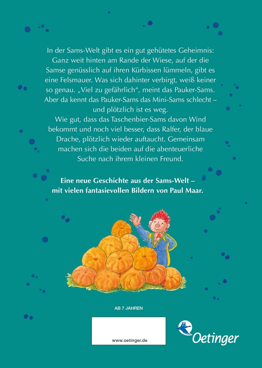 In der Sams-Welt gibt es ein großes Geheimnis: Ganz weit hinten am Rande der Wiese, auf der die Samse genüsslich auf ihren Kürbissen lümmeln, steht eine geheimnisvolle Felsmauer. Niemand weiß genau, was sich hinter ihr verbirgt. Das Pauker-Sams findet es dort viel zu gefährlich. Aber da kennt es das Mini-Sams nicht, das plötzlich spurlos verschwunden ist. So macht sich das Taschenbier-Sams gemeinsam mit Ralfer, dem blauen Drachen, auf eine abenteuerliche Suche nach seinem kleinen Freund. Werden sie das Mini-Sams finden?