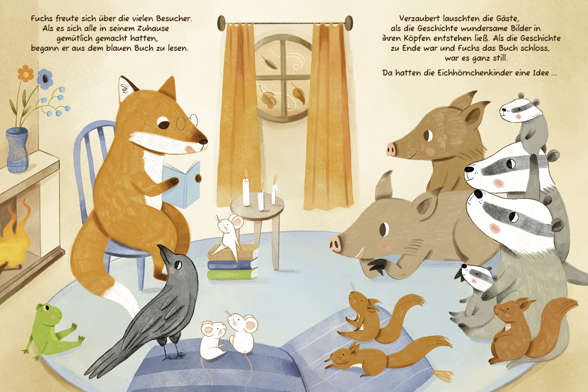 "Eine wunderschöne Geschichte zum Dahinschmelzen😍 Tolle Bilder und eine bezaubernde Geschichte, die lange in Erinnerung bleibt. Hier geht es um die Waldtiere und die Bücherliebe. Wir sind begeistert😍😍😍" < Jurga