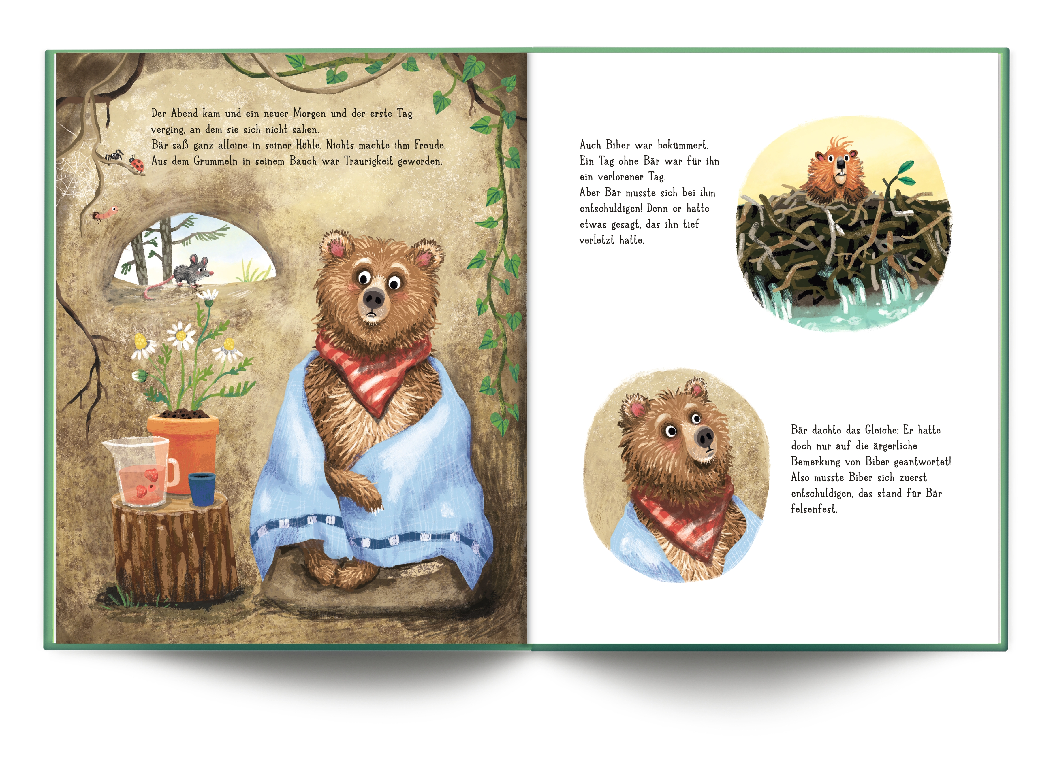 Bär freut sich so! Er trifft seinen besten Freund Biber am See! Doch dann sagt Biber etwas, das Bär gar nicht gefällt. Seit wann ist Biber denn so fies? Dabei hat Biber es gar nicht so gemeint und versteht nicht, warum Bär sauer ist. Grummelnd gehen beide davon. Sollte sich Bär entschuldigen? Oder sollte Biber sich entschuldigen? Keiner der beiden traut sich, und so vergeht ein Tag nach dem anderen, an dem sie sich nicht sehen und schrecklich vermissen. Bis ihnen schließlich klar wird, wie wichtig es ist, den Mut zu haben, Entschuldigung zu sagen. Denn beste Freunde gehen gemeinsam durch dick und dünn!