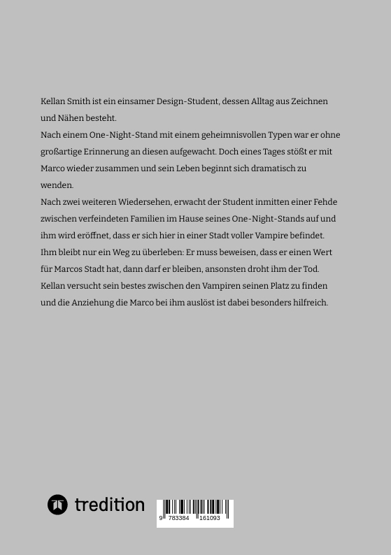 Kellan Smith ist ein einsamer Design-Student, dessen Alltag aus Zeichnen und Nähen besteht.Nach einem One-Night-Stand mit einem geheimnisvollen Typen war er ohne großartige Erinnerung an diesen aufgewacht. Doch eines Tages stößt er mit Marco wieder zusammen und sein Leben beginnt sich dramatisch zu wenden.Nach zwei weiteren Wiedersehen, erwacht der Student inmitten einer Fehde zwischen verfeindeten Familien im Hause seines One-Night-Stands auf und ihm wird eröffnet, dass er sich hier in einer Stadt voller Vampire befindet.Ihm bleibt nur ein Weg zu überleben: Er muss beweisen, dass er einen Wert für Marcos Stadt hat, dann darf er bleiben, ansonsten droht ihm der Tod.Kellan versucht sein bestes zwischen den Vampiren seinen Platz zu finden und die Anziehung die Marco bei ihm auslöst ist dabei besonders hilfreich.