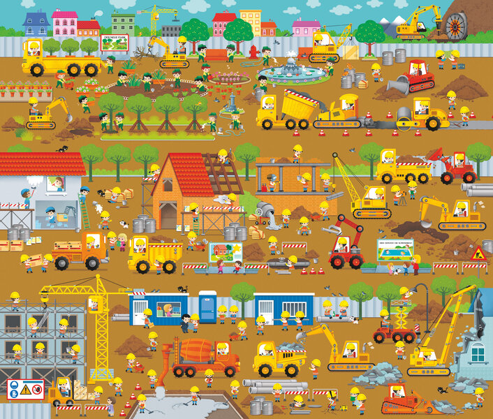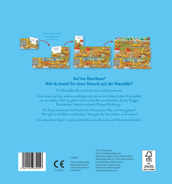 Die Baustelle lädt zum Erkunden und Staunen ein.Eine Seite nach der anderen entflatet sich das Buch zu einem großen farbenfrohen Wimmelbild als Spielmatte in der Größe von 88 x 66 cm.Und was gibt es dort nicht alles zu entdecken. Kräne, Bagger, Bauarbeiter und jede Menge Werkzeug. Die Texte animieren die Kinder zum Mitmachen: Was wird hier gebaut? Wen gibt es im Bild zu entdecken? Wie geht die Geschichte wohl weiter?