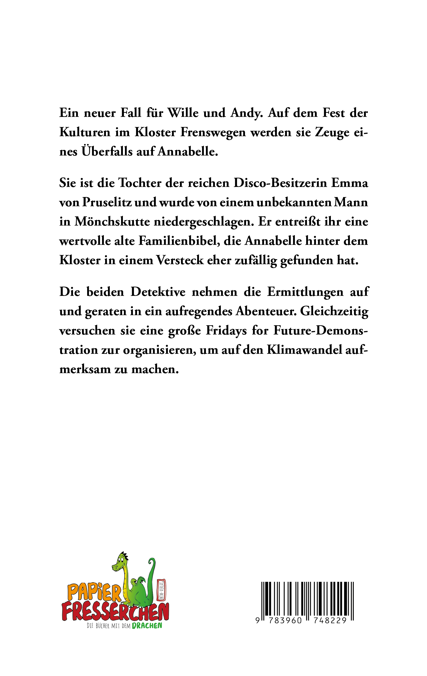 Ein neuer Fall für Wille und Andy. Auf dem Fest der Kulturen im Kloster Frenswegen werden sie Zeuge eines Überfalls auf Annabelle. Sie ist die Tochter der reichen Disco-Besitzerin Emma von Pruselitz und wurde von einem unbekannten Mann in Mönchskutte niedergeschlagen. Er entreißt ihr eine wertvolle alte Familienbibel, die Annabelle hinter dem Kloster in einem Versteck eher zufällig gefunden hat.