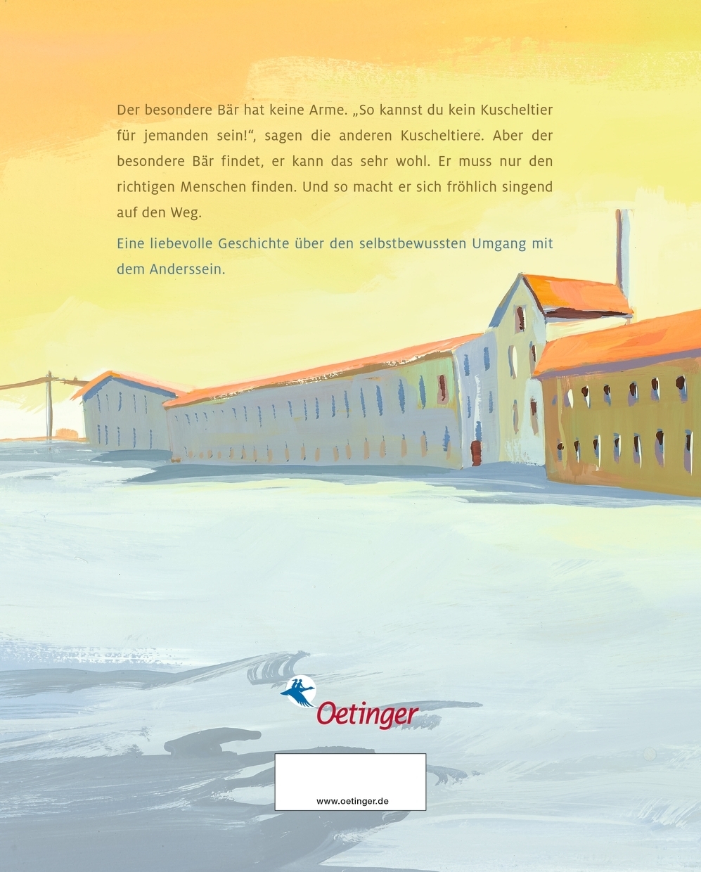 Der besondere Bär hat keine Arme. So kannst du kein Kuscheltier für jemanden sein!, sagen die anderen Kuscheltiere. Aber der besondere Bär findet, er kann das sehr wohl. Er muss nur den richtigen Menschen finden. Und so macht er sich fröhlich singend auf den Weg.