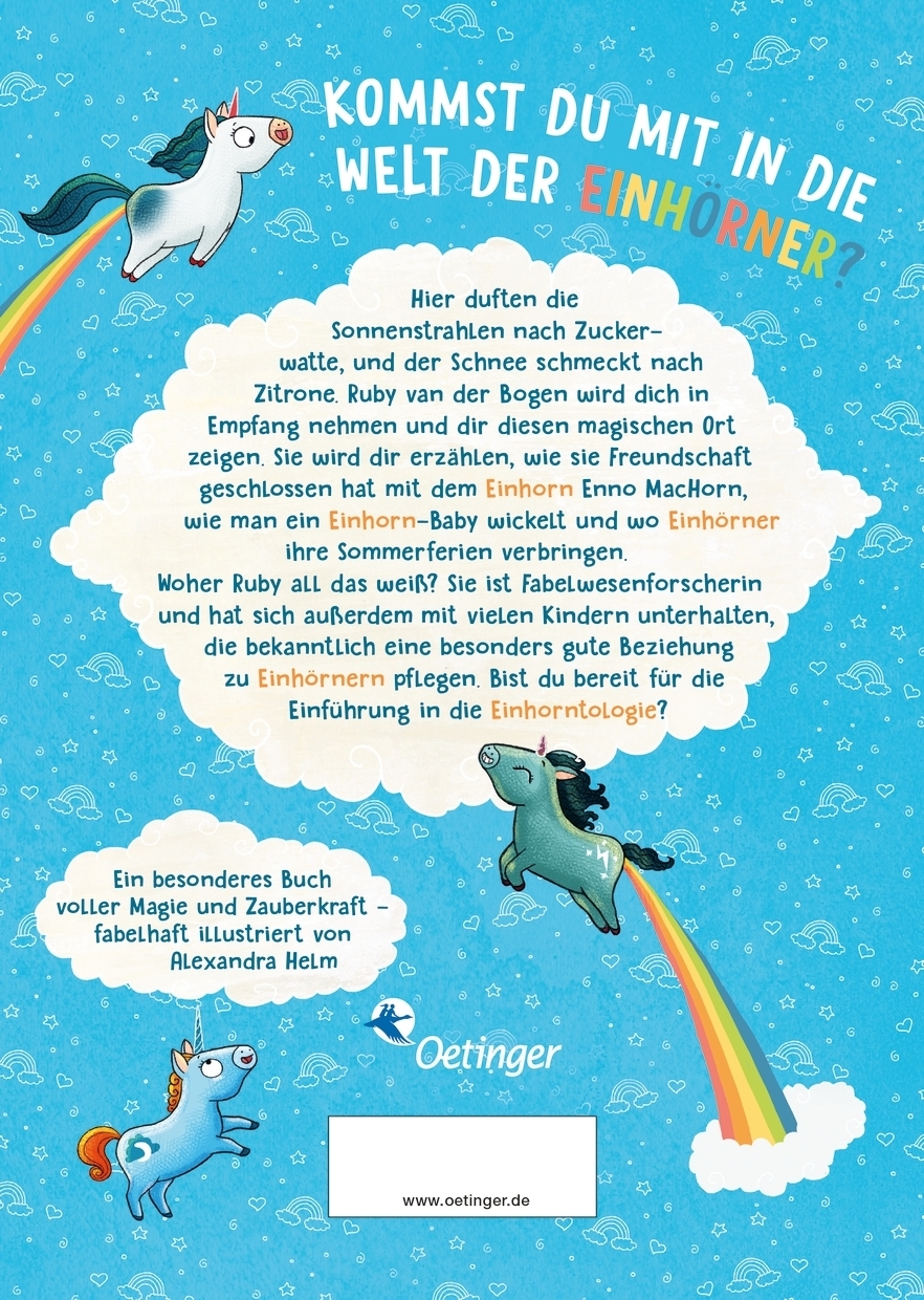 Die Welt der Einhörner ist voller Magie und Fantasie. Wie genau es dort aussieht, wie man mit einem Einhorn Freundschaft schließt, wo Einhörner Urlaub machen, und was passiert, wenn sich Einhörner erkälten – all das beschreibt Ruby van der Bogen in kurzen Vorlesegeschichten. Sie erzählt von ihrem besten Freund, dem Einhorn Enno MacHorn, und von dem kleinen magischen Haus, in dem sie lebt. Und sie erklärt, wie Kinder selbst die Einhornwelt erforschen und so zu neuen Einhorntolog*innen werden können. Eine Art Anleitung zum Eintauchen in Fantasiewelten und ein Leben voller Magie. Einfach fabelhaft!