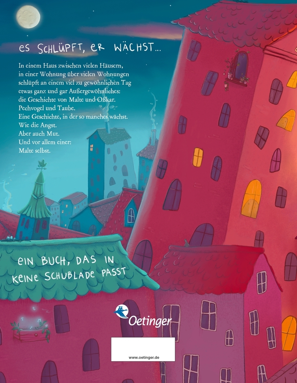 In einem Haus zwischen vielen Häusern, in einer Wohnung über vielen Wohnungen lebt ein Junge. Malte. Auf den ersten Blick wirkt Malte ganz und gar gewöhnlich. Doch was kein Blick verrät: Malte hat Angst. Angst vor den Schatten da draußen. Nur in seiner Wanne, der kleinsten Badewanne der Welt, fühlt er sich sicher. Und genau hier passiert Malte an einem viel zu gewöhnlichen Tag etwas ganz und gar Außergewöhnliches: Er trifft seinen besten Freund. Oßkar, die Taube. Und wer hätte gedacht, dass dieses kleine Wesen Malte auf eine ganz besondere Reise führt, seine größte Reise: die Reise zu seiner Angst. Und zu sich selbst.
